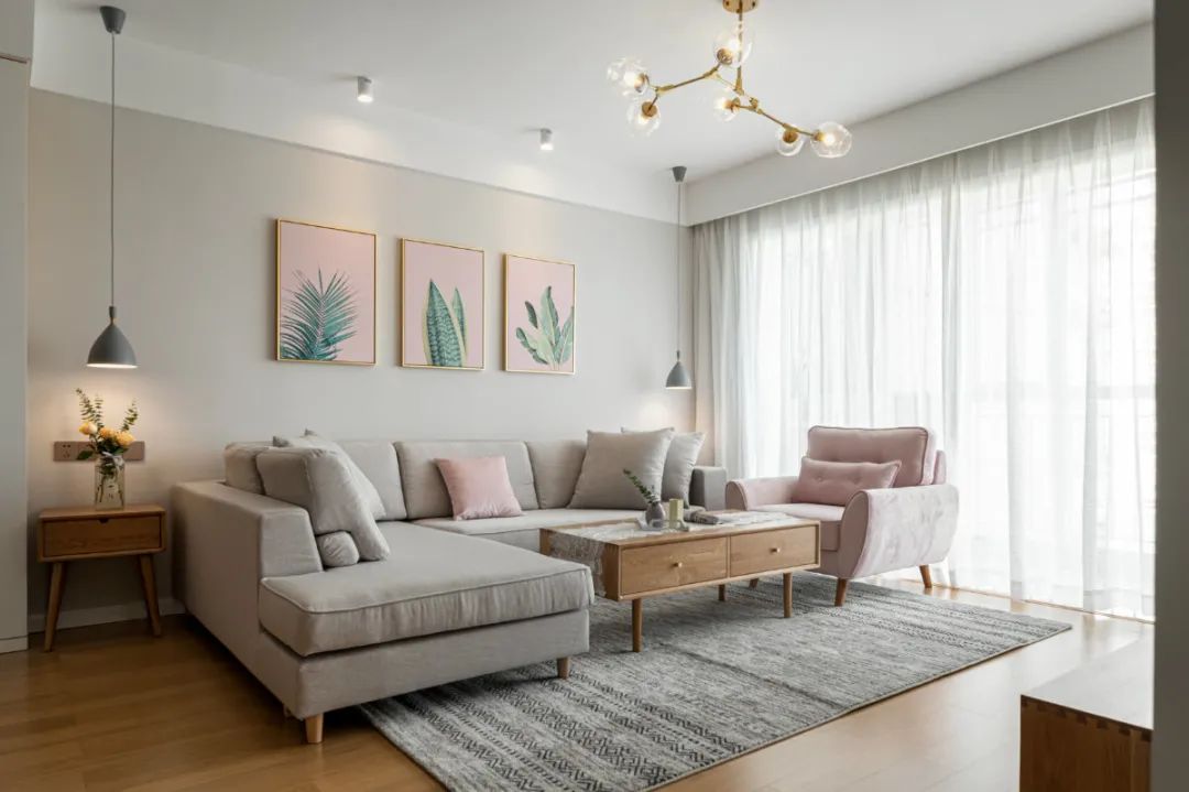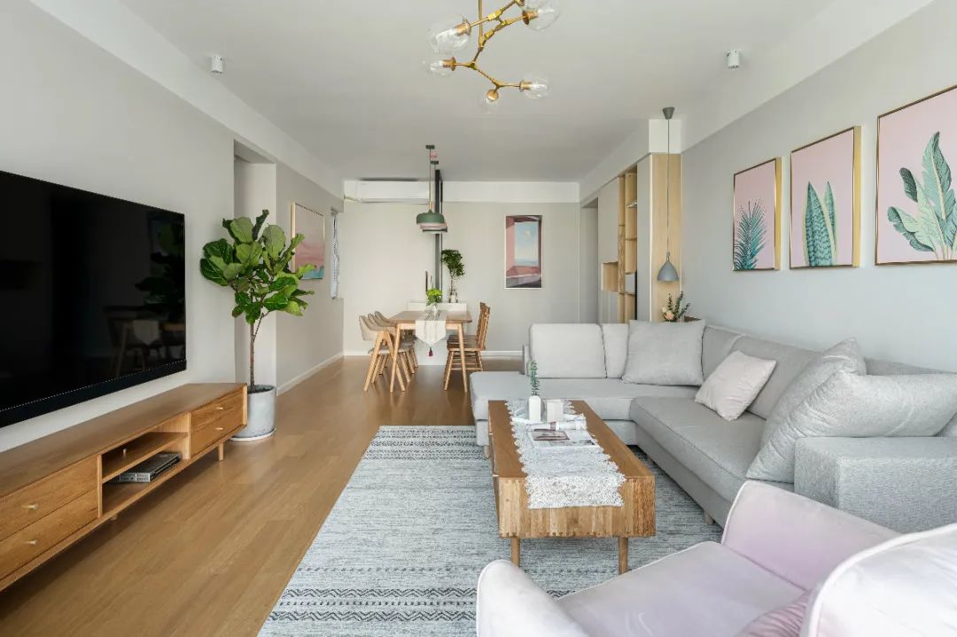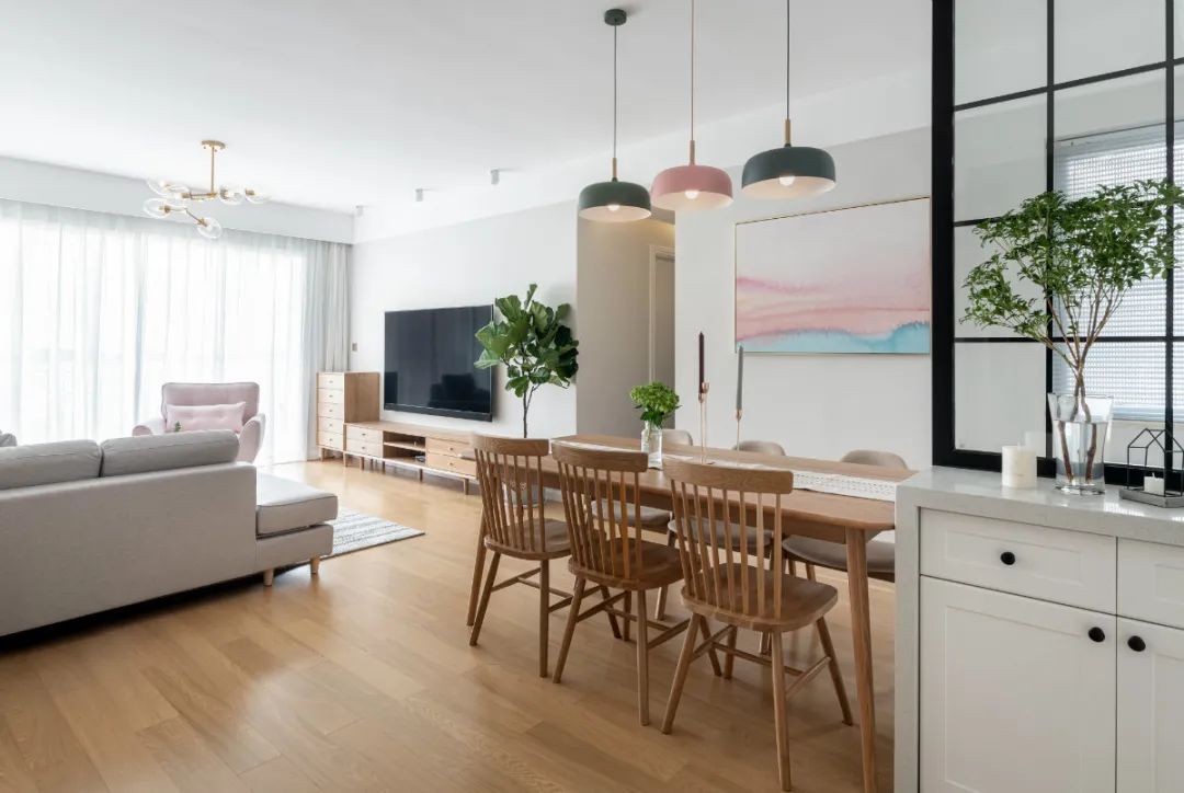 今天蓝海盛饰就给大家带来一套125㎡暖色调北欧风装修案例,全屋以灰白、粉、绿为主色调,搭配原木家具、淡雅温馨的软装布置,营造出一个活泼又不失温馨的家。