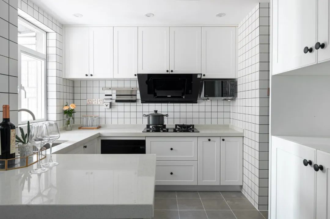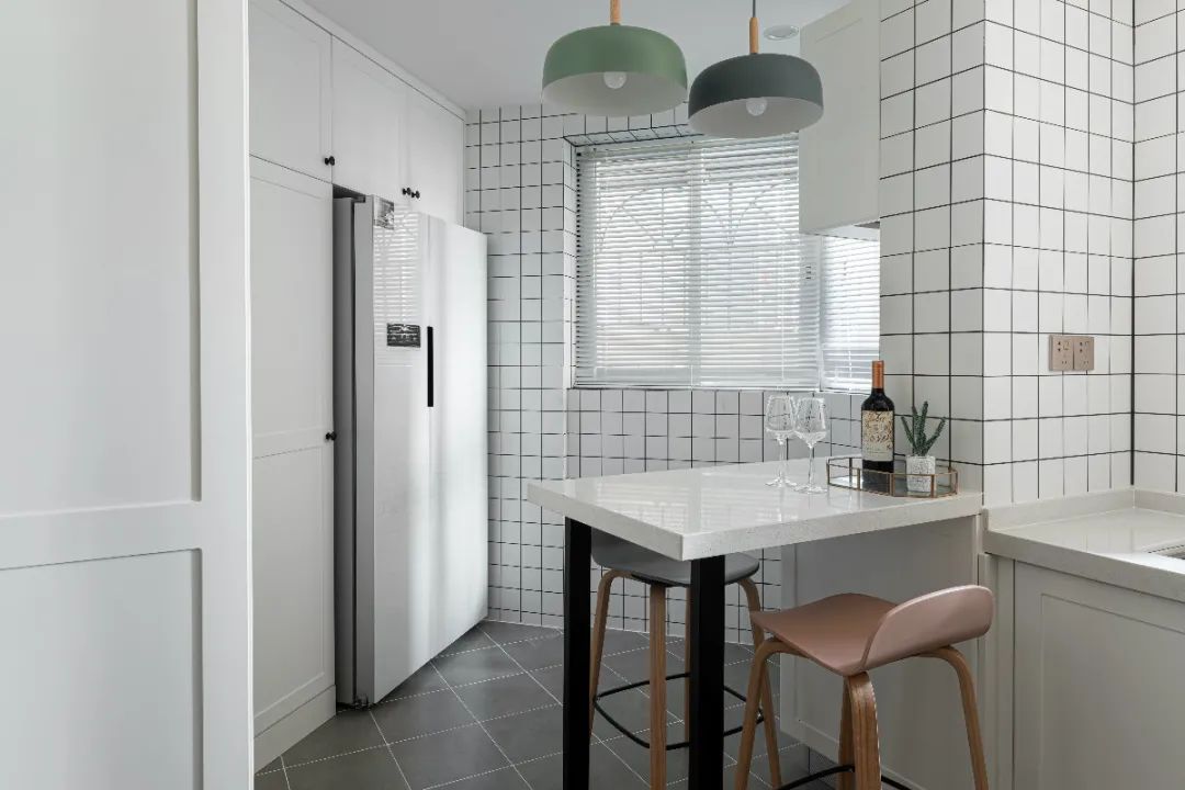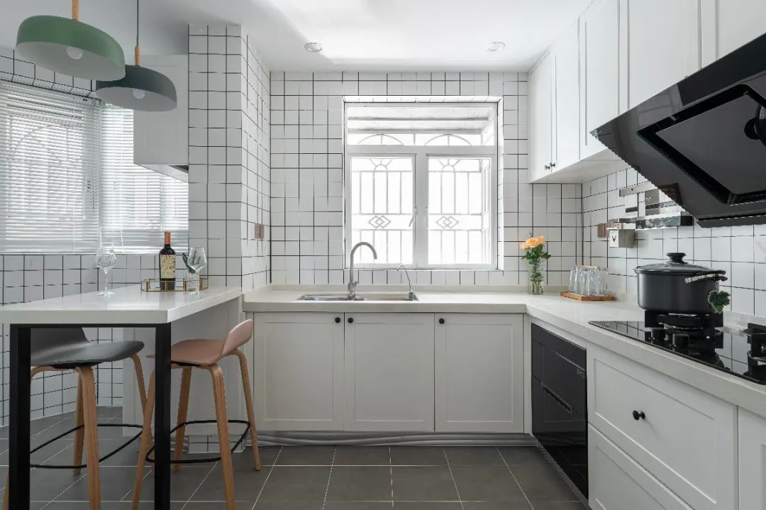 厨房墙面采用小白砖填黑色美缝,地面灰色水泥砖,搭配白色的亚光烤漆柜门点缀黑色小纽扣,文艺感满满。