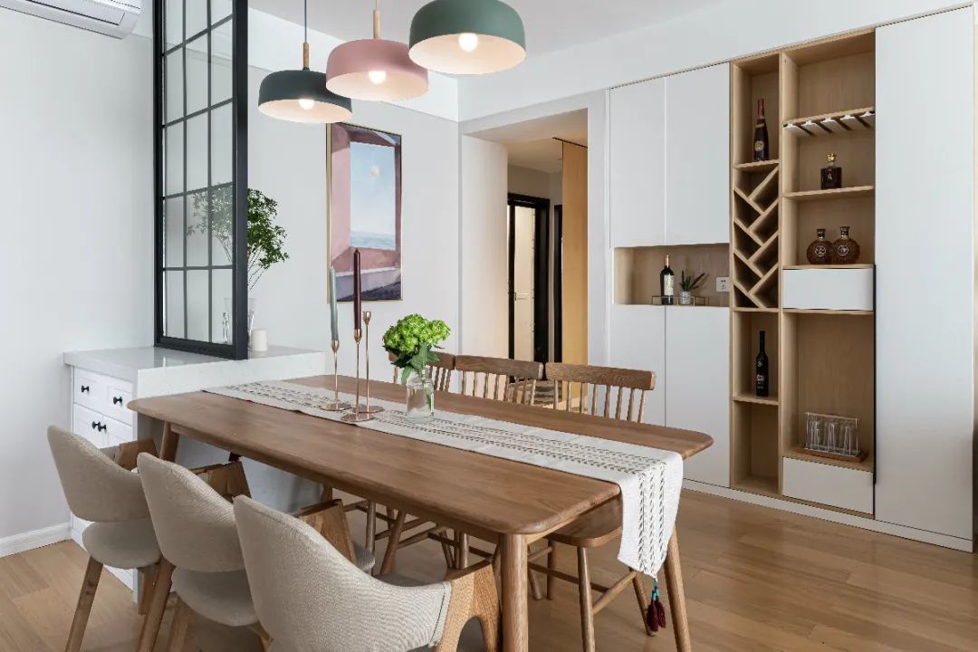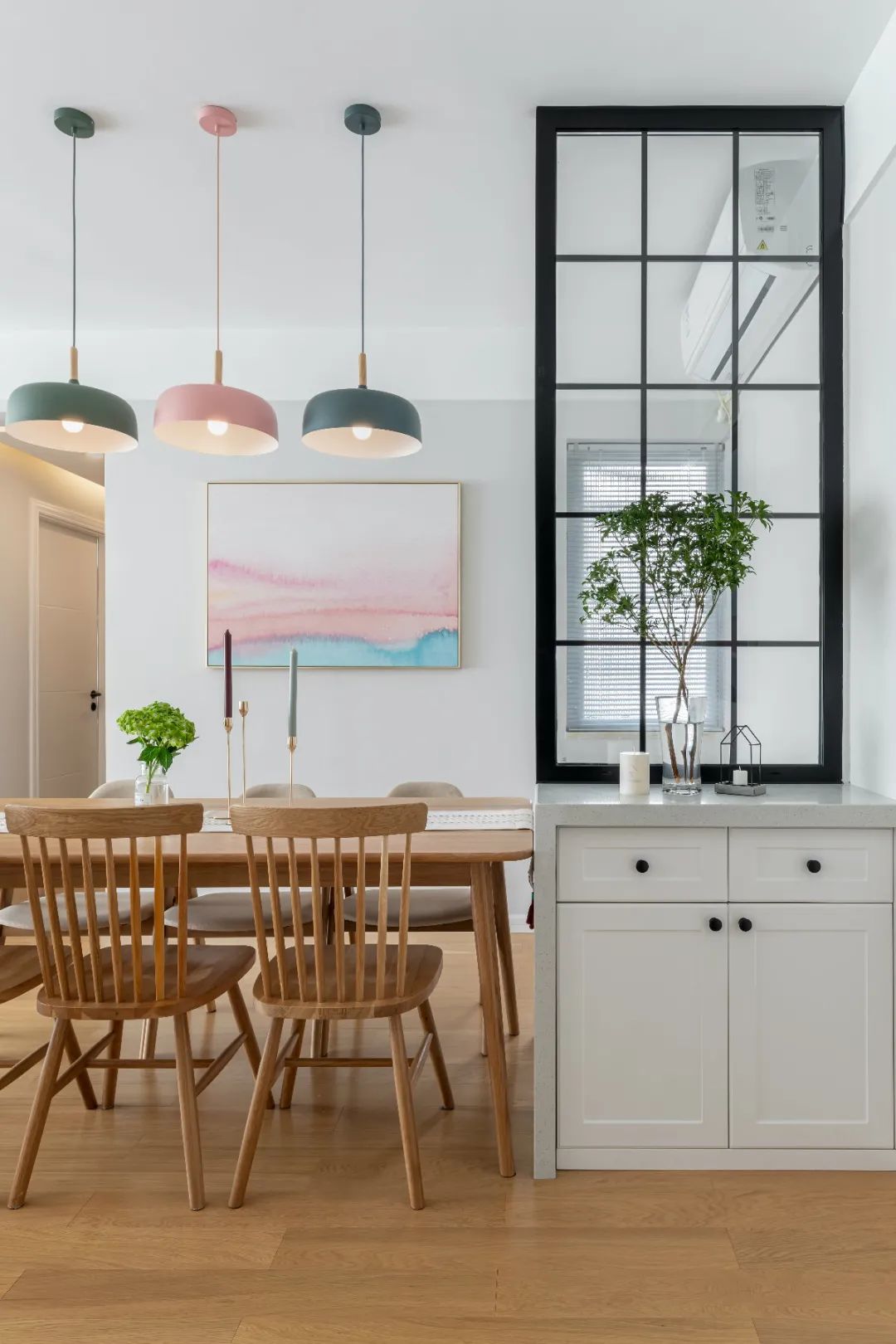餐边柜与屏风的结合设计,既增加了餐边柜的储物功能,也隔断玄关进门即是小窗,增加玄关景的效果。