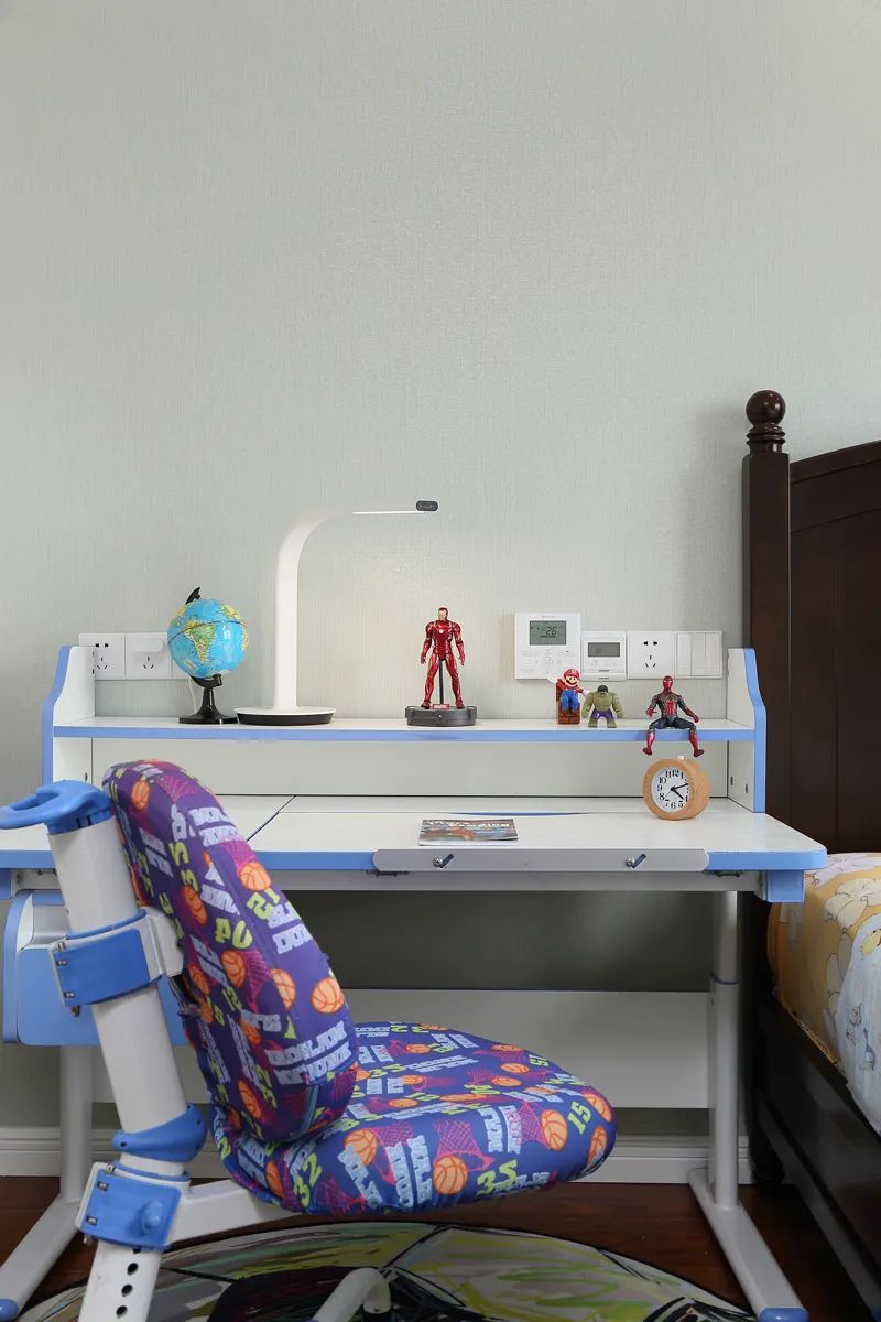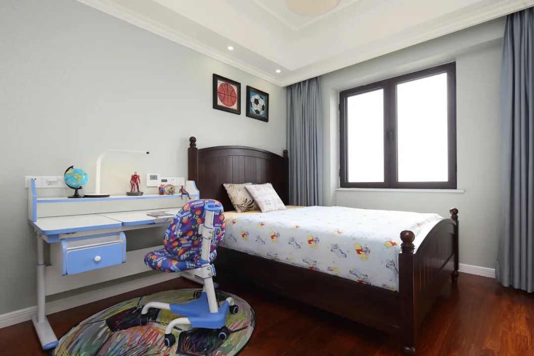 ▲儿童房在蓝灰色的墙面基础,实木床上布置童趣图案的床单,床边摆上儿童书桌,为孩子提供了一个从容舒适的学习与休息空间。