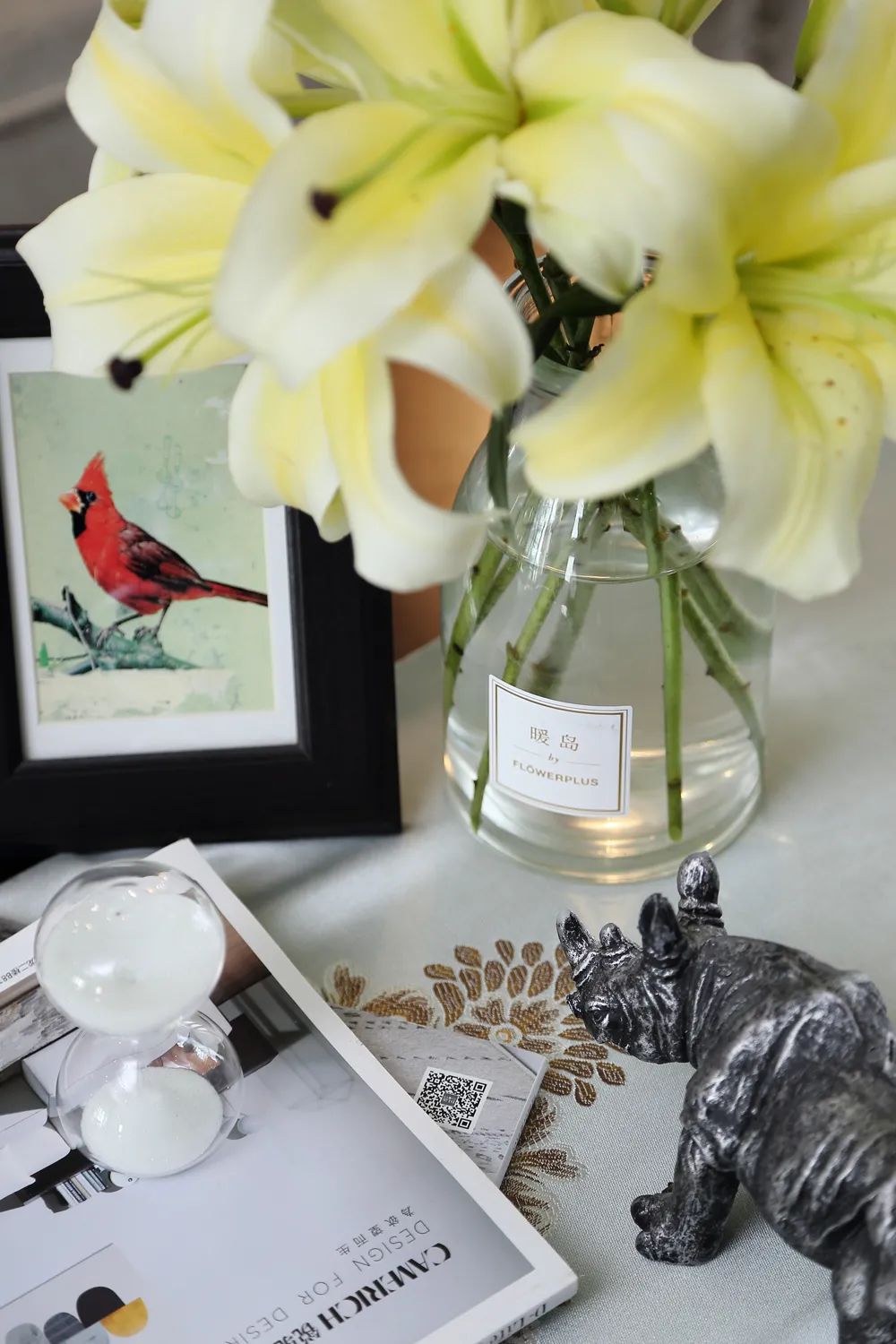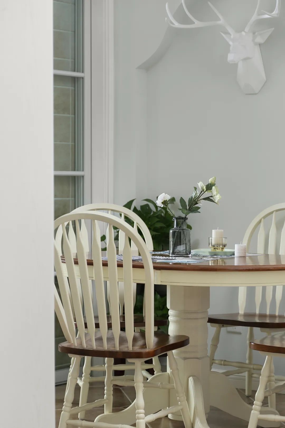 ▲绿叶图案的黑框装饰画,还有极简的白色挂钟,餐桌上的花瓶与烛台,清新优雅的布置,使得用餐氛围充满浪漫舒适的仪式感。