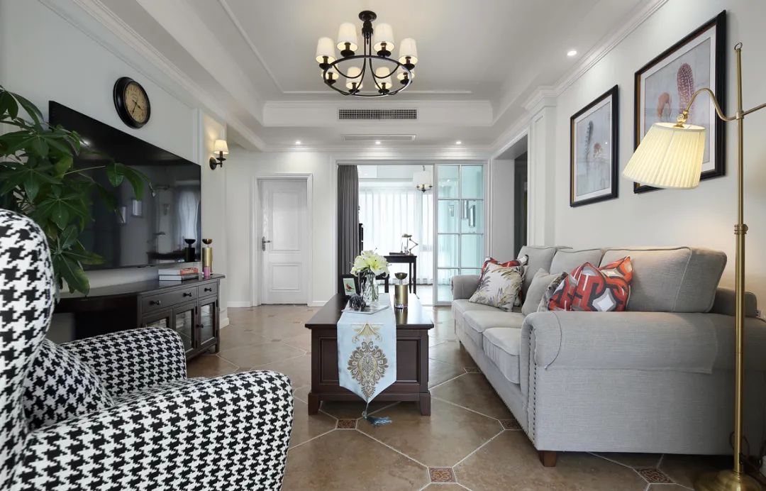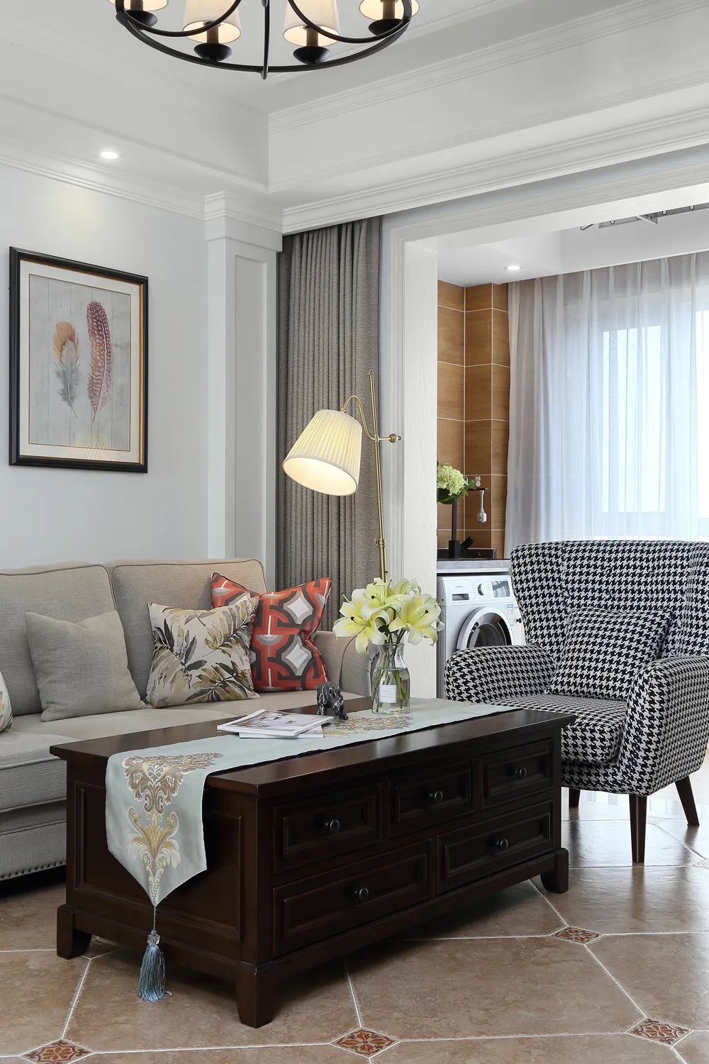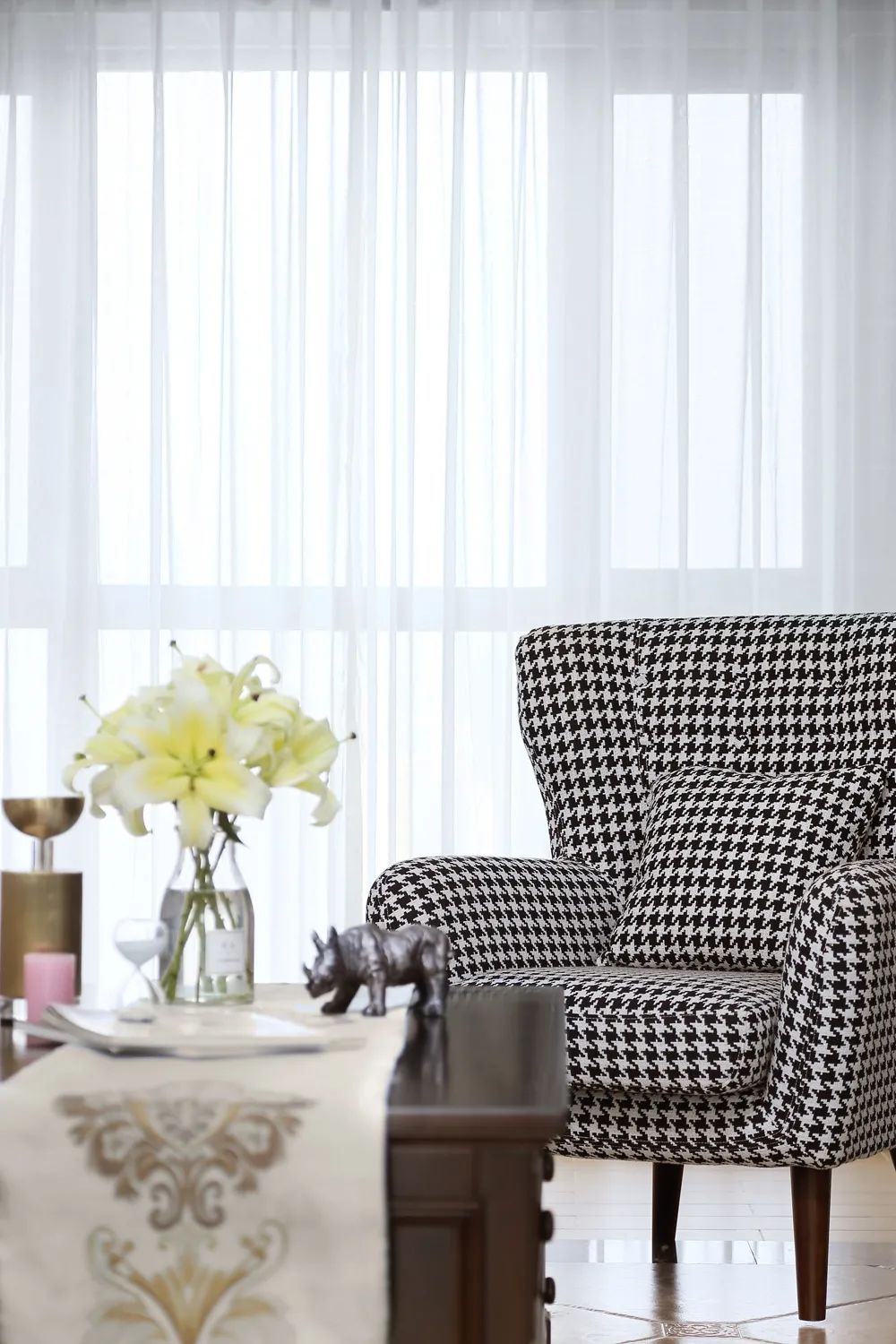 ▲黑白格纹的小沙发椅,布置在现代美式风的客厅里,也增加了几分优雅时尚的空间气息。