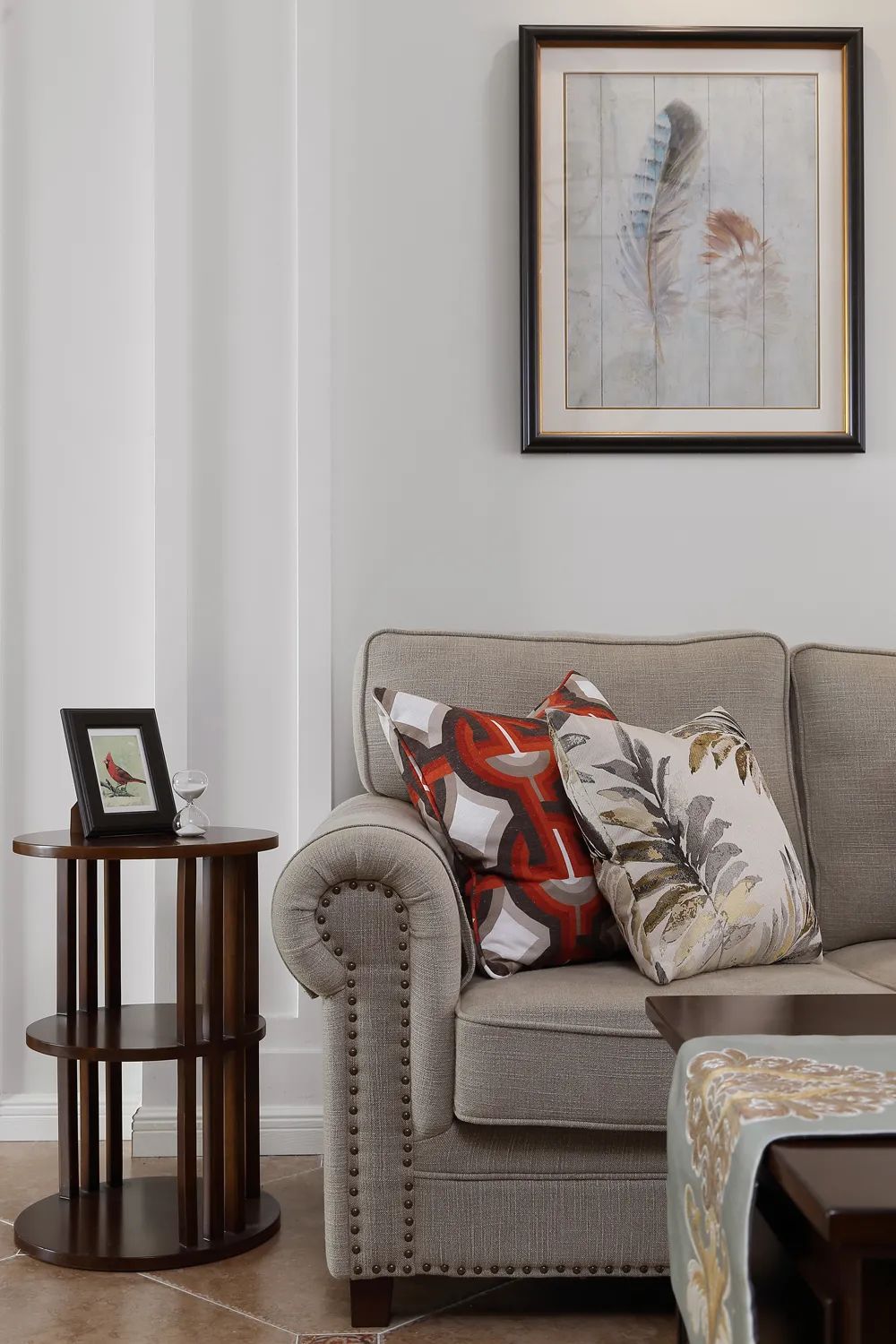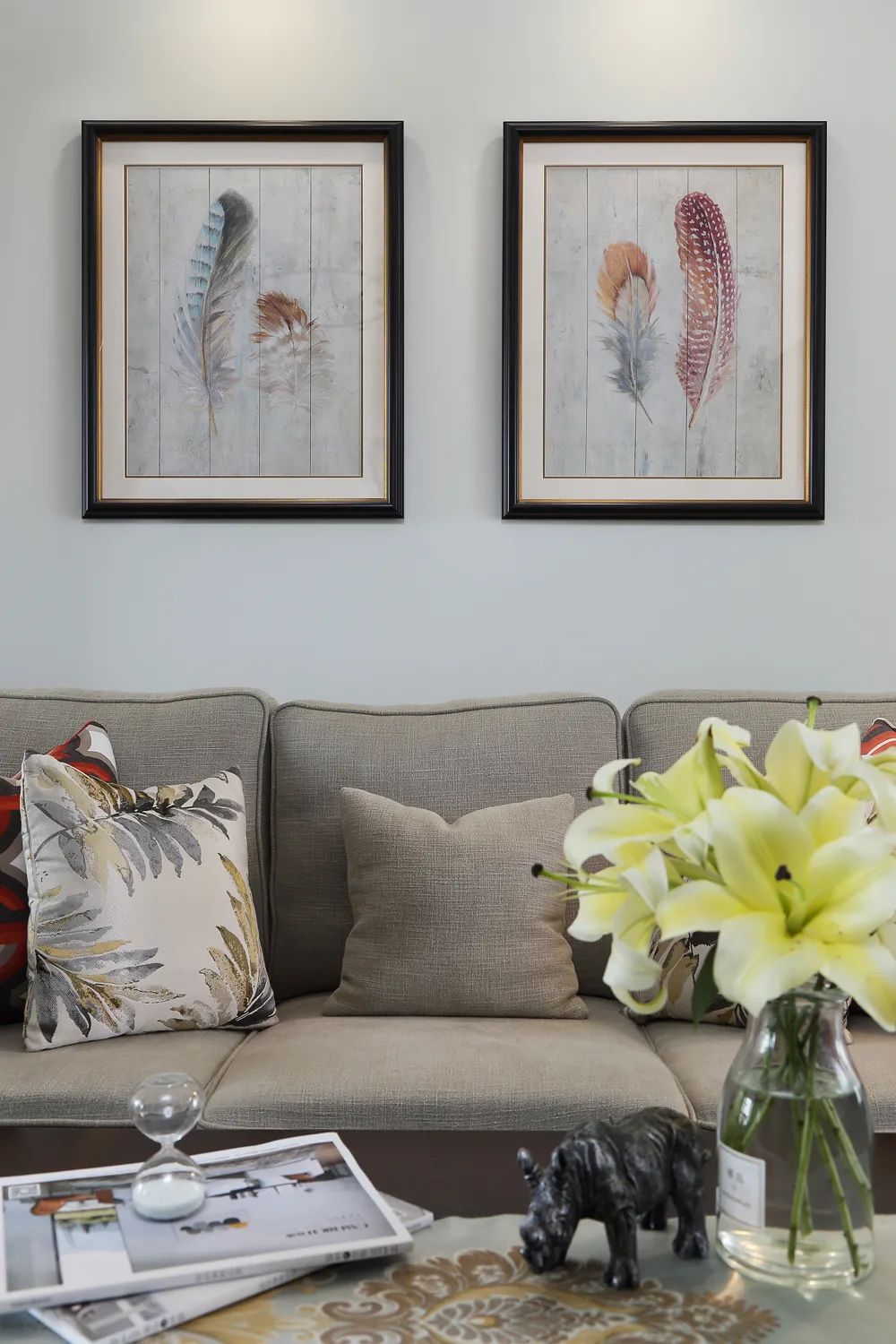 ▲灰色的布艺沙发,还有沙发墙上的彩色羽毛挂画,精致大方的家具与细节布置,让客厅显得现代舒适而成熟大气。