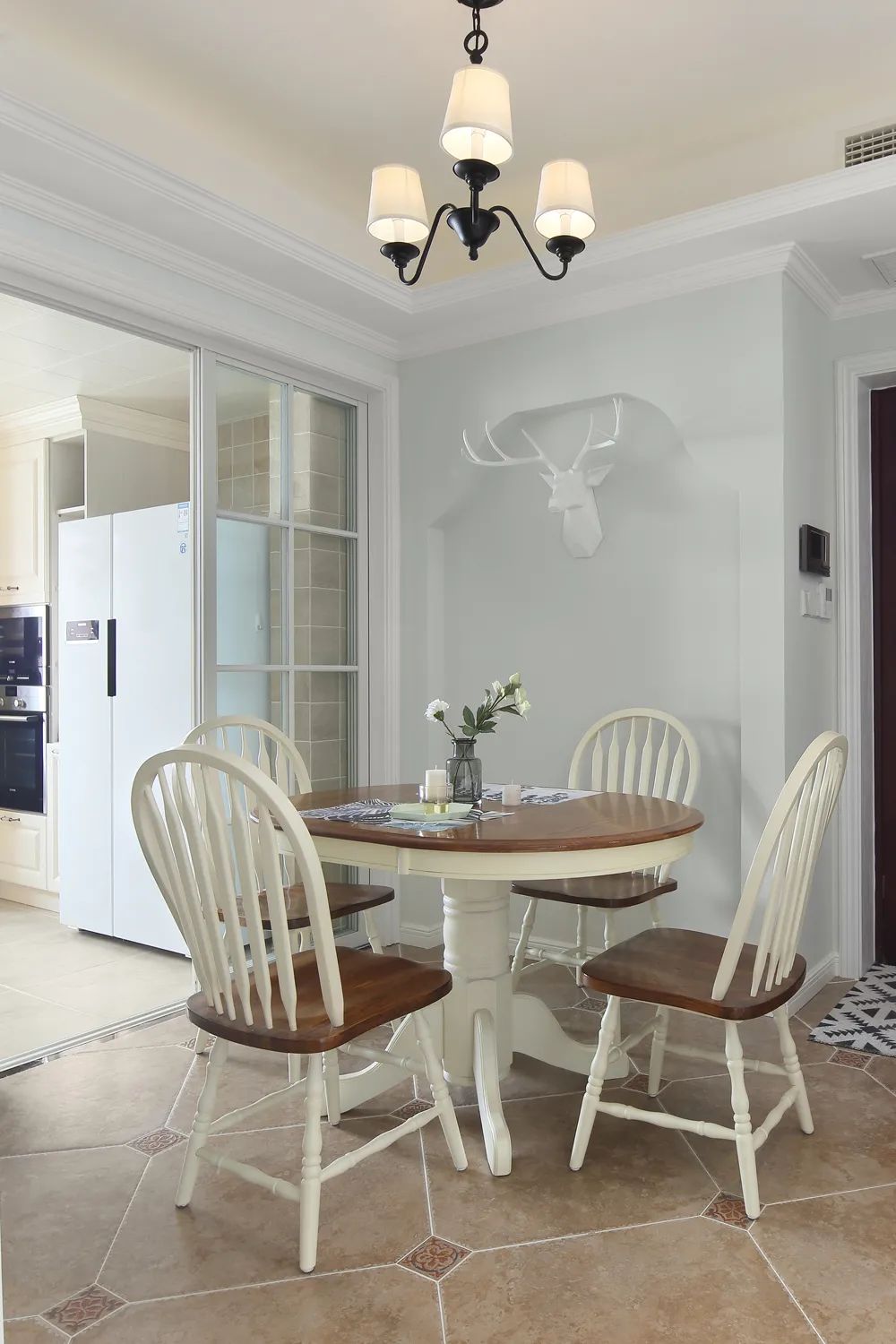 ▲餐厅与客厅保持统一的棕色复古砖,布置上白色+木色拼色的餐桌椅,旁边背景墙挂一个鹿头装饰,让空间显得格外的优雅高级而华丽。