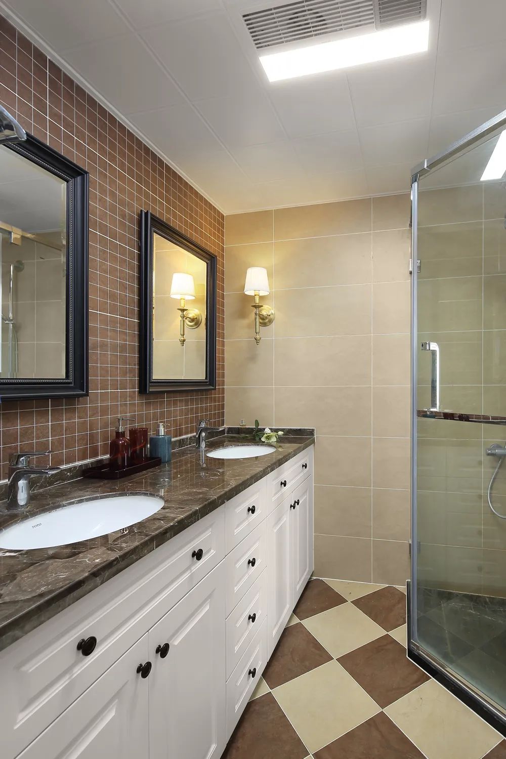 ▲卫生间地面是斜铺的双拼色地砖,洗手盆采取双人位的设计,侧边墙面加入壁灯的装饰,让卫浴空间也充满优雅端庄的实用感。