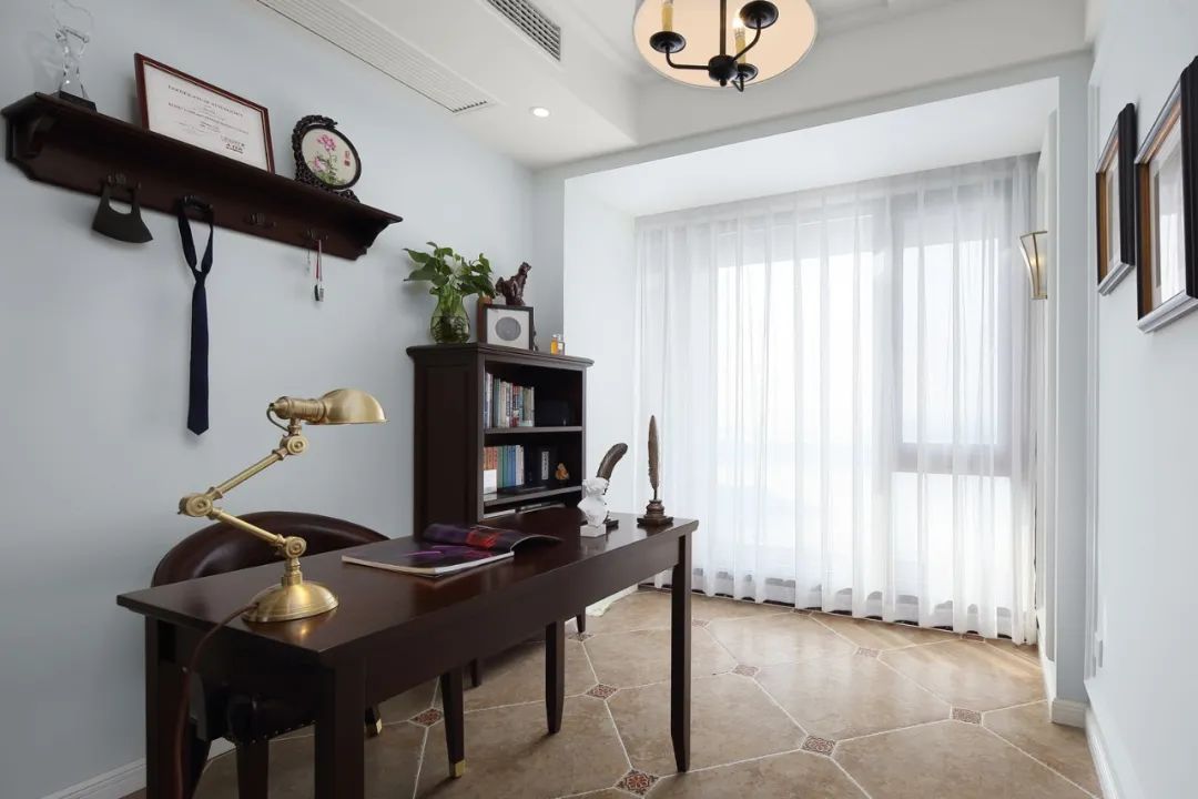▲书房空间以淡蓝色的墙面,中间位置布置一张成品书桌椅与书架,书桌后方装一个有趣的挂钩,摆上精致的摆饰品,让工作看书的空间充满自然舒适的端庄感。