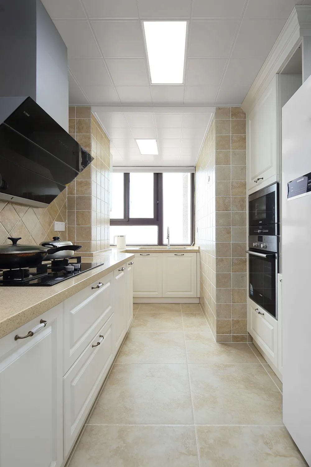 ▲厨房也是保持淡棕色的墙面地面砖,墙砖的尺寸较小,让空间层次感更加明显。把小阳台打通纳入厨房区域,让烹饪做饭空间更加宽敞自在。而白色的定制橱柜,结合嵌入式的电器设计,也提供了方便舒适的烹饪方式。