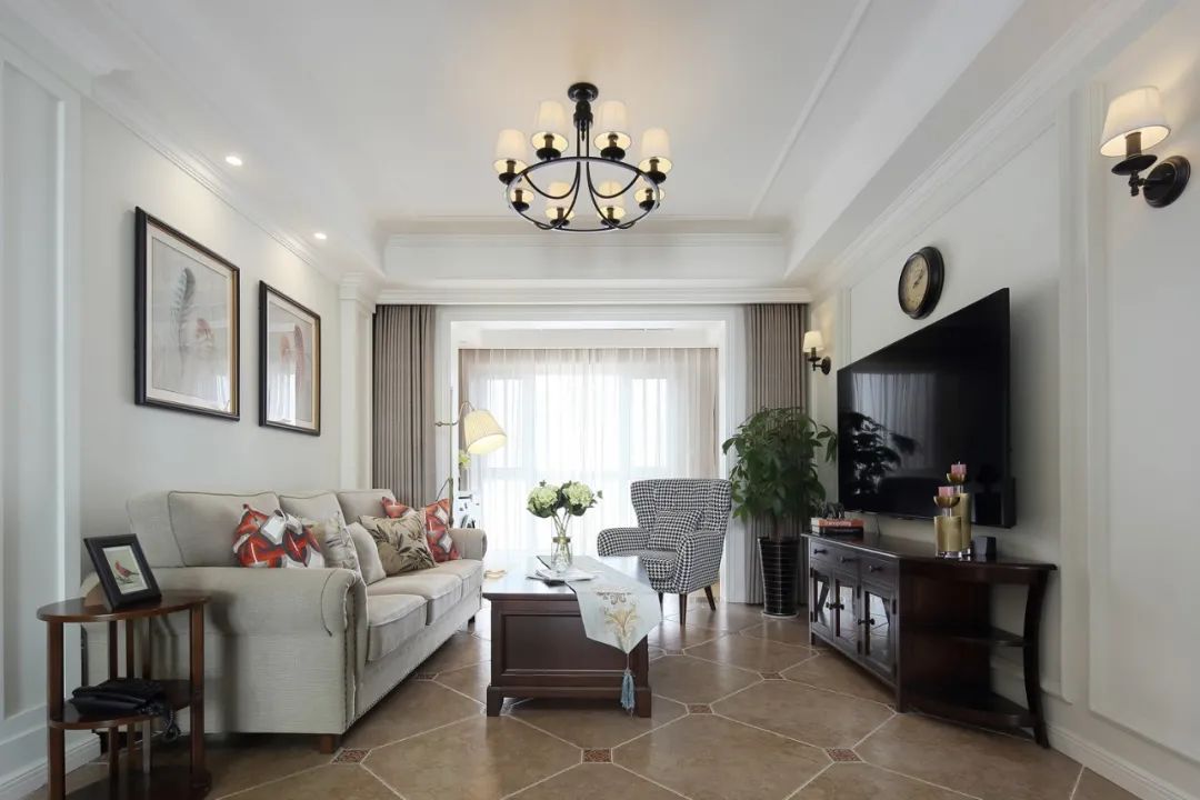 ▲现代美式风格的客厅空间,以棕色的斜铺地砖,布置现代美式范的布艺沙发,还有深木色的电视柜与茶几,整体现代大方的空间,给人以一种轻松舒适的成熟与端庄气质感。