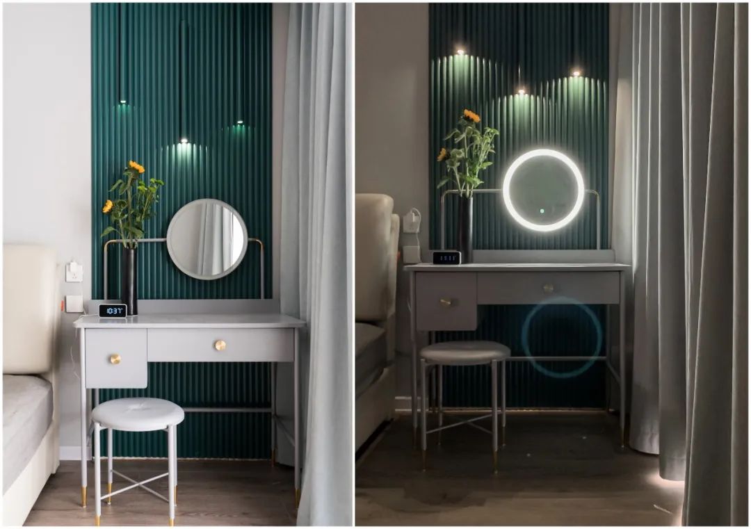 在梳妆台的位置着重处理,墙面定制墨绿色金属管和竖条灯,高雅复古又精致。