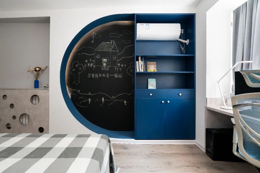 入门墙上整合书柜、黑板墙和暖气片,并在黑板墙的位置结合灯光做了一轮弯月,未来用作儿童房使用时,留给小朋友一个有趣的世界。