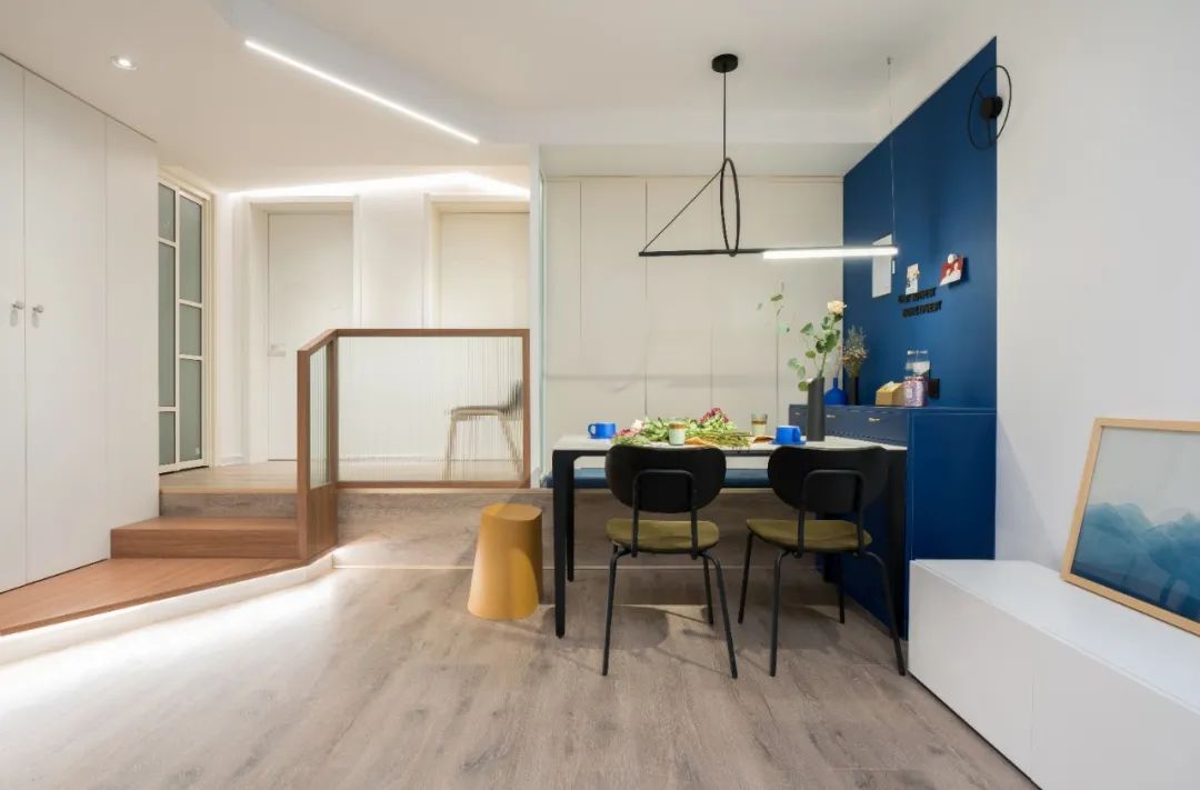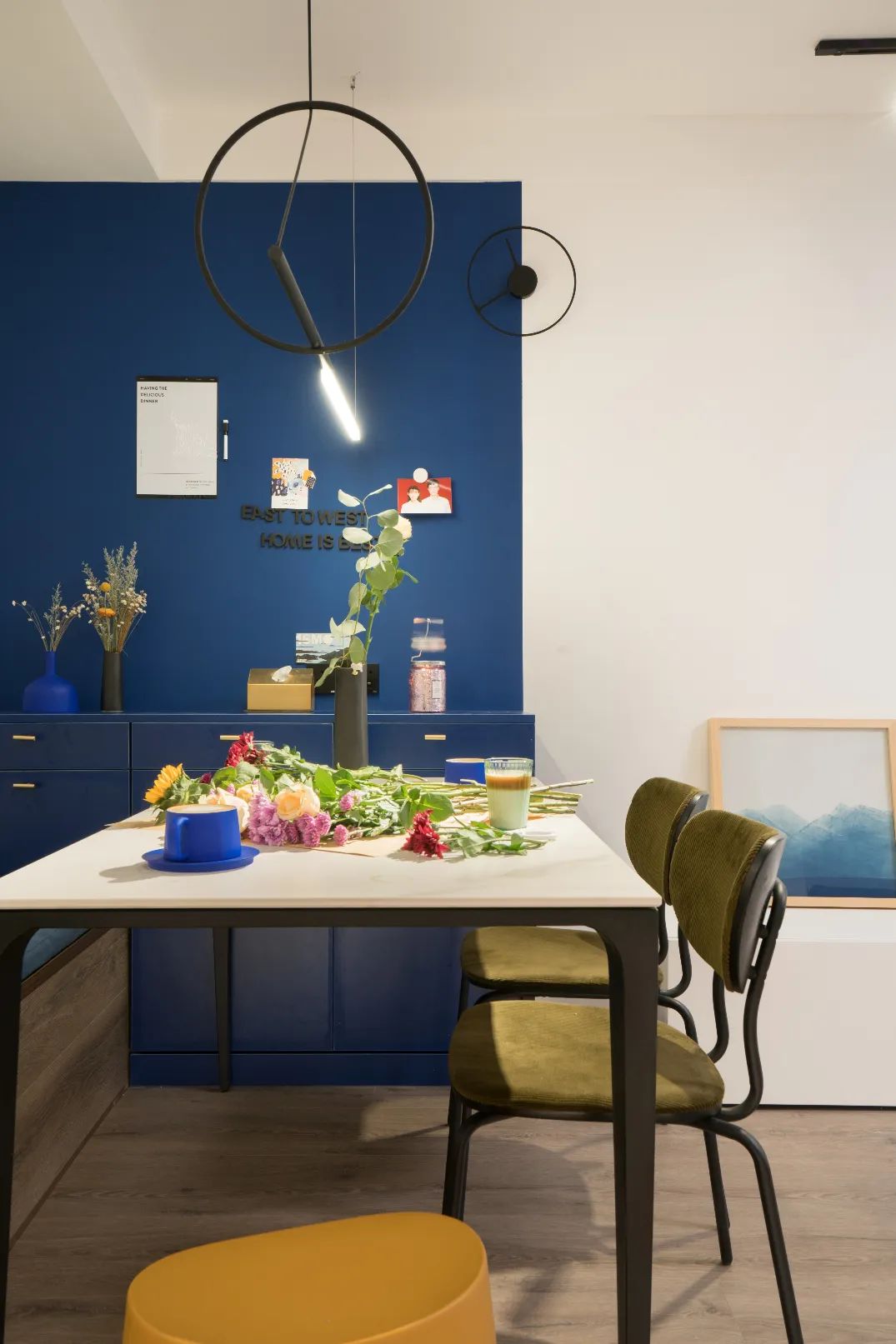 客餐厅看似合为一体,却用蓝色墙面区分开两个空间。靠墙打造了卡座,可以容纳更多人用餐。