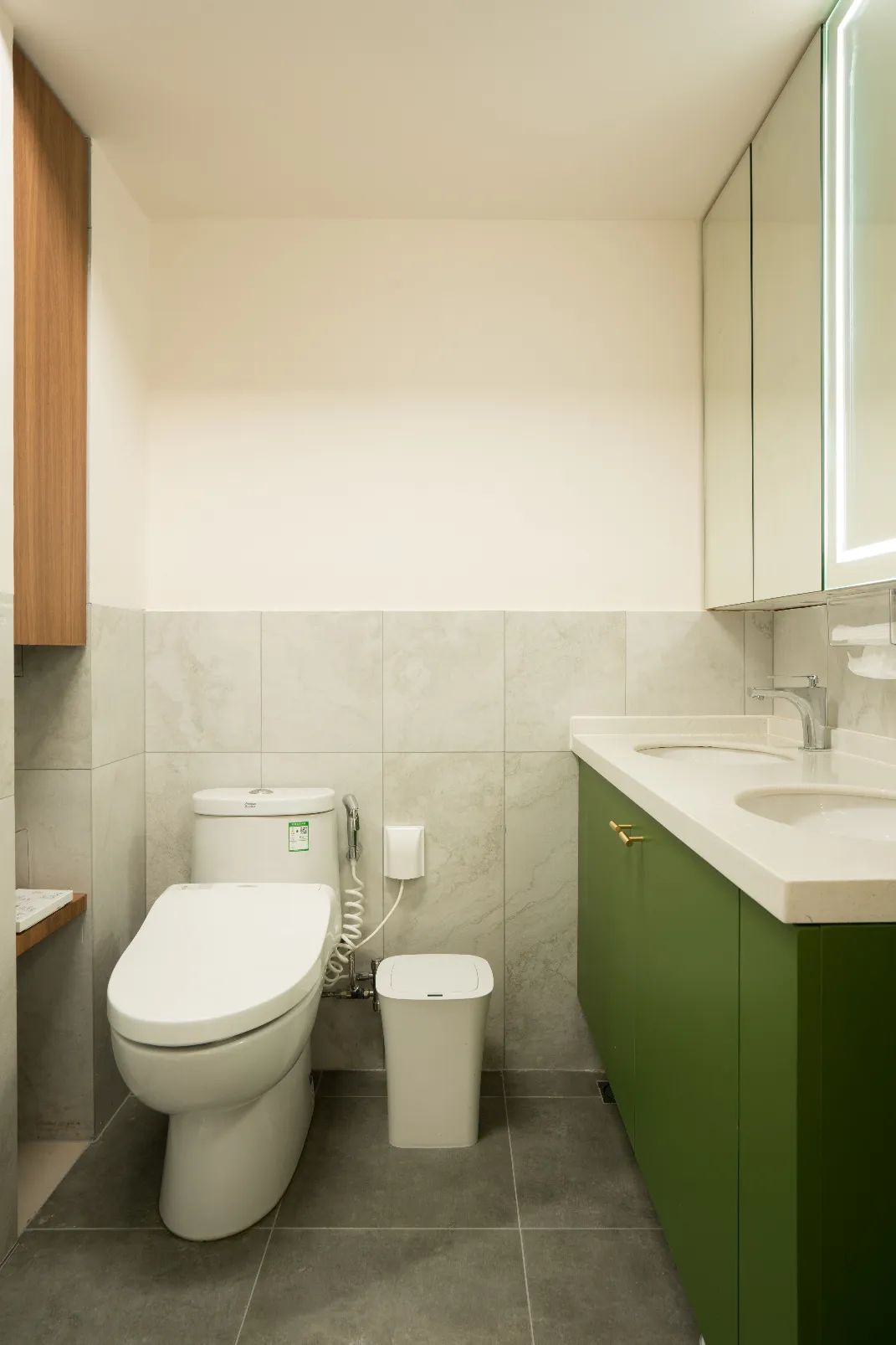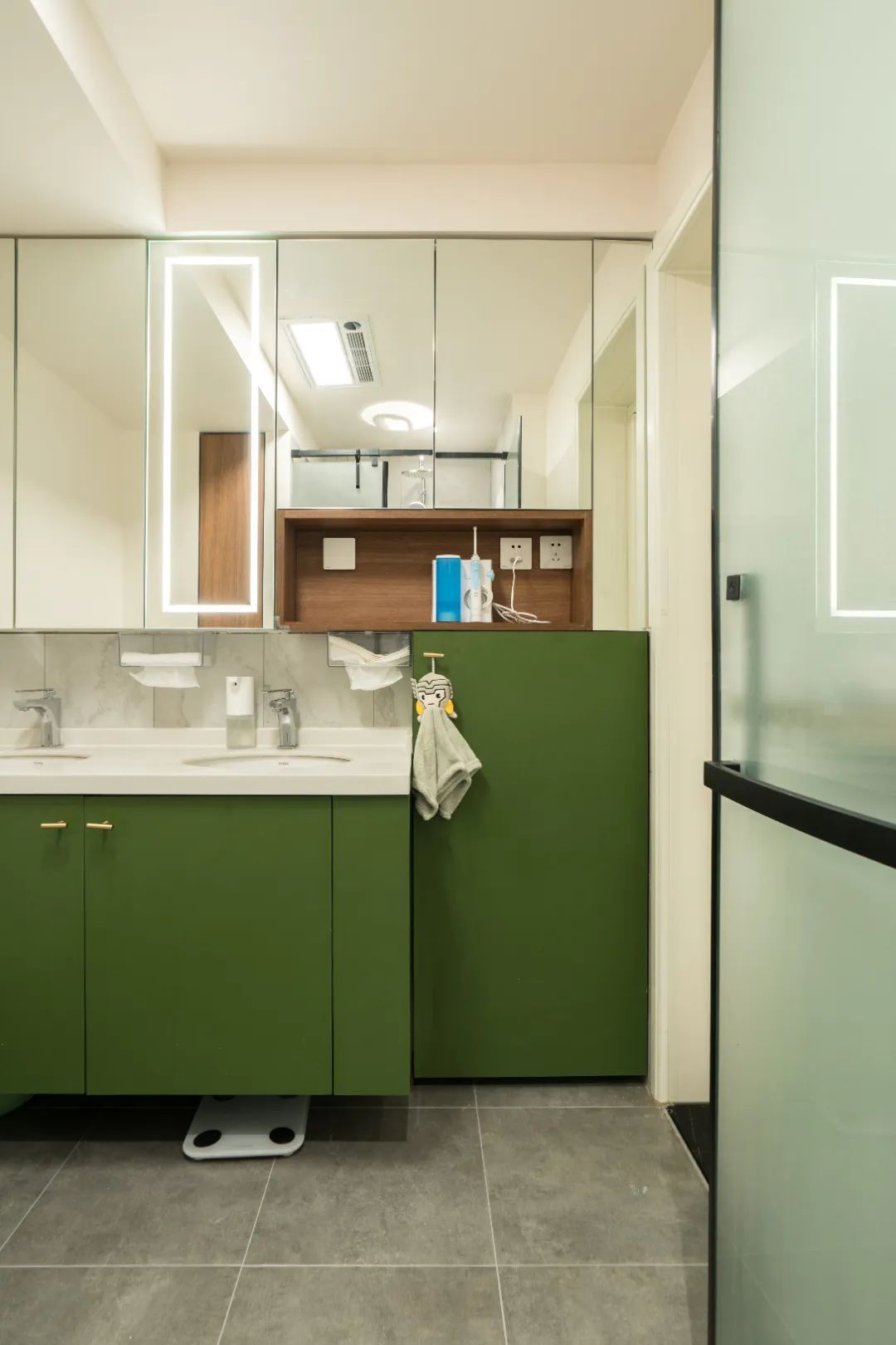 卫生间用镜柜+浴室柜来做收纳,为了方便存放物品和使用插座,用木色区分出开放式收纳格。色彩上与柜体的绿色和谐混搭,功能上与柜子组合。