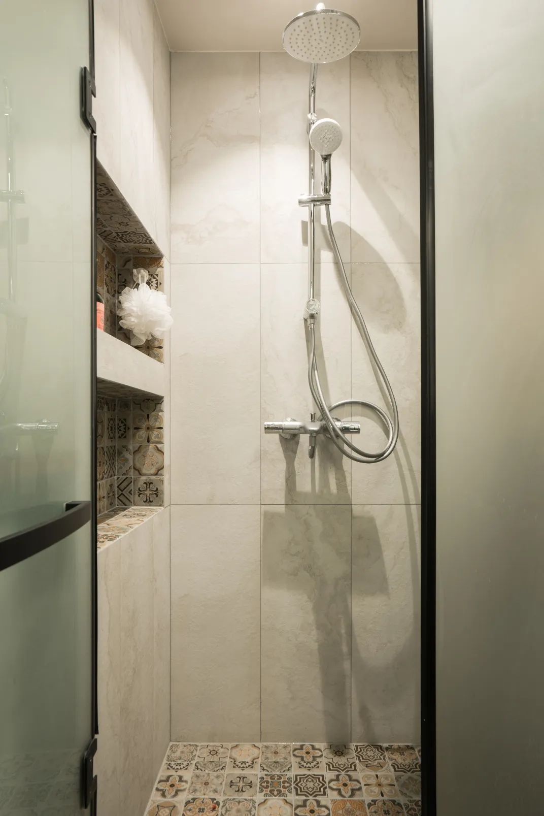 淋浴区用磨砂玻璃隔开,保证通透性和隐私性。侧面的墙体上制作壁龛用来储物,可以放置浴球、沐浴露等杂物。