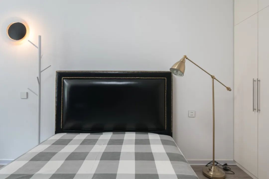 次卧暂时用做客房和书房,不过布局上还是以未来的儿童房为模板,成品家具也方便以后改造。黑色漆面单人床,搭配床头灯和挂衣架,线条感和帅气兼备。