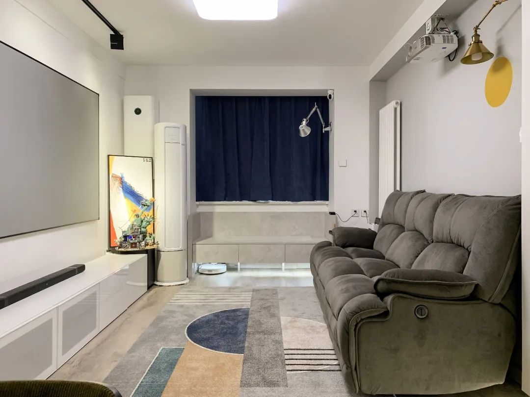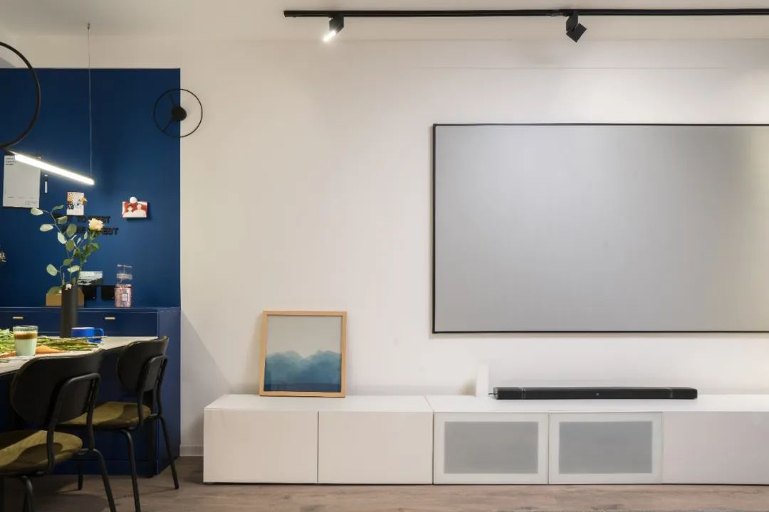 电视背景墙没有做过多设计,保持最简单的样子。黑色轨道灯可随意调节光源,配上大荧幕,在家也能有绝佳的观影体验。角落里抽象的彩色画成为一抹亮眼的点缀。