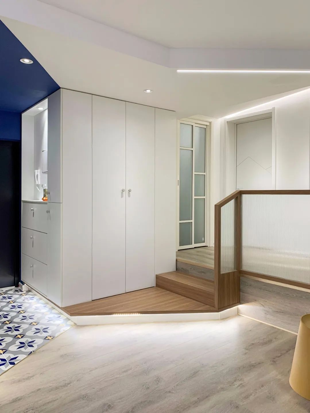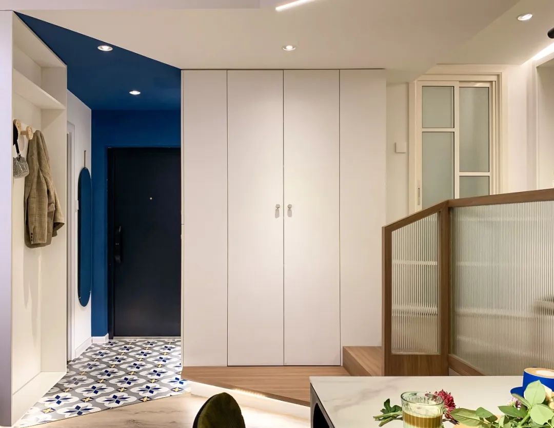 玄关结合空间独有的错层,做了L形的收纳柜,满足收纳需求。顶面与墙面用蓝色做区域划分,也更加有立体感。
