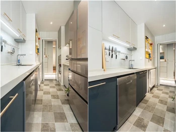 厨房两侧用来收纳家电和洗菜区,尽头用作烹饪区,光线充足,通风方便。橱柜尺寸经过精心推算,预留出大小合适的通道。