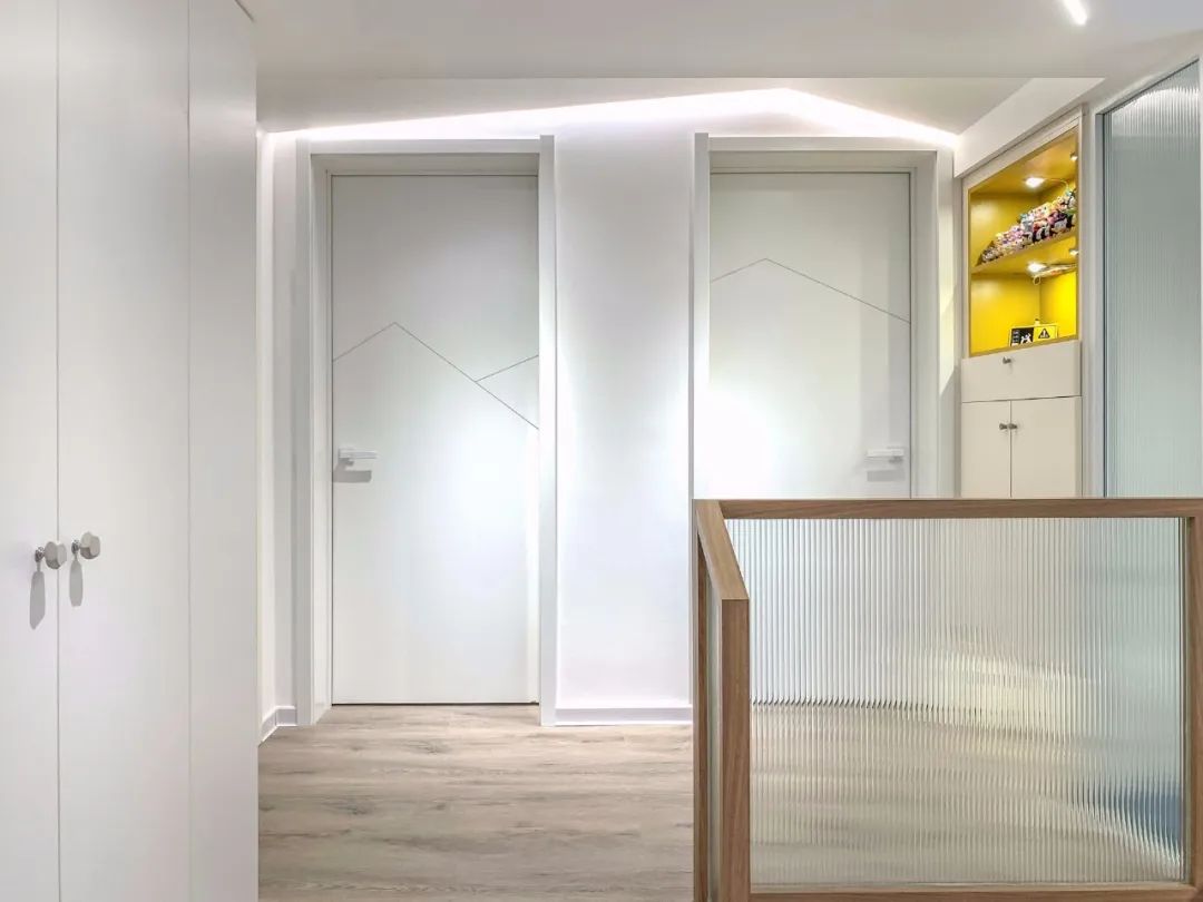 走道以白色为主,最右边展示架的黄色带给纯白空间活泼与明媚。楼梯与一旁的卡座衔接都选择长虹玻璃,提升整体通透性,也能让空间隔而不断,彼此衔接。