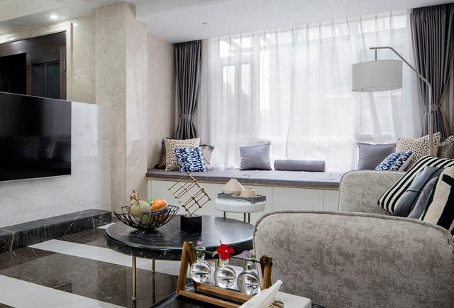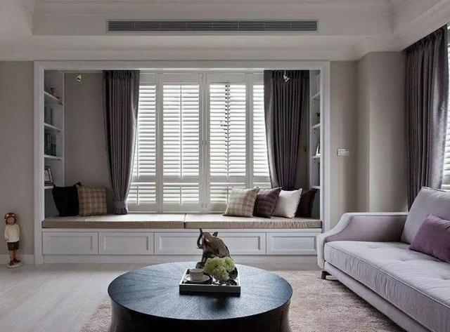 这种设计也相对比较简单,不需要多么繁冗复杂的操作,只需要在飘窗空间铺上飘窗垫,也可以根据自己需求,加上靠背设计或者柜架组合,定制沙发就呈现出来了,搭配上合适的小茶几,待人接物丝毫不受影响。