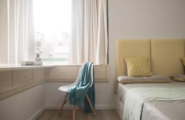 如果飘窗的宽度比较窄,也可以直接改造成书桌,这种设计更适合客房空间,面积虽然狭小,却能够让你安心办公或者学习。别忘了在飘窗底部做几个收纳柜,这样放一些小杂物完全足够了,还不会浪费空间!