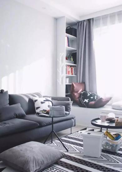 像案例中这样,在飘窗的四周都做成整体组合柜,开放式的组合柜兼具展示功能,封闭式的柜体也能够满足储物需求,外扩的柜体将整面墙都利用起来,不浪费1㎡的空间!