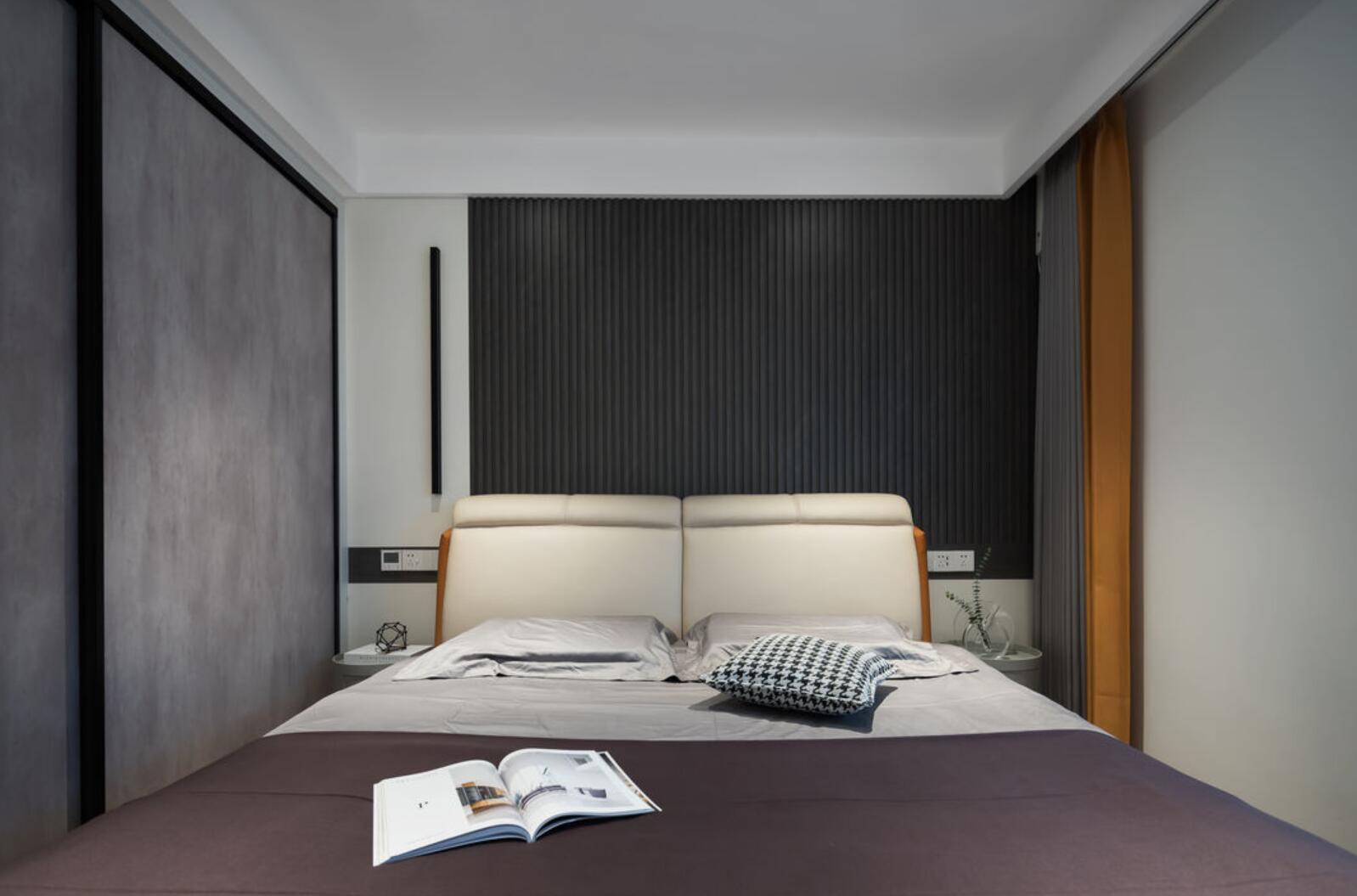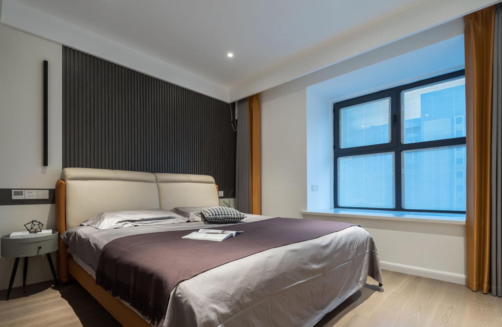 主卧延续了客厅的设计思路,床头背景墙利用木饰面、软包两种材质来设计,不仅让视觉有了一定的延伸性,也为空间增添了一抹静谧,且具有品质般的氛围感。而具有深黄色元素的窗帘、床,都巧妙地与其它空间做到了联系。