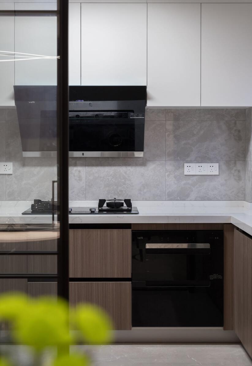 虽说厨房做开放式设计,更能体现出空间的大气,但在家里人多,且厨房使用率比较高的情况下,给厨房安装上移门隔断,还是非常有必要的,可以彻底解决油烟外溢的问题。而白色的上柜,搭配上木色的下柜,也很好地加深了空间层次,并不失烟火气息。