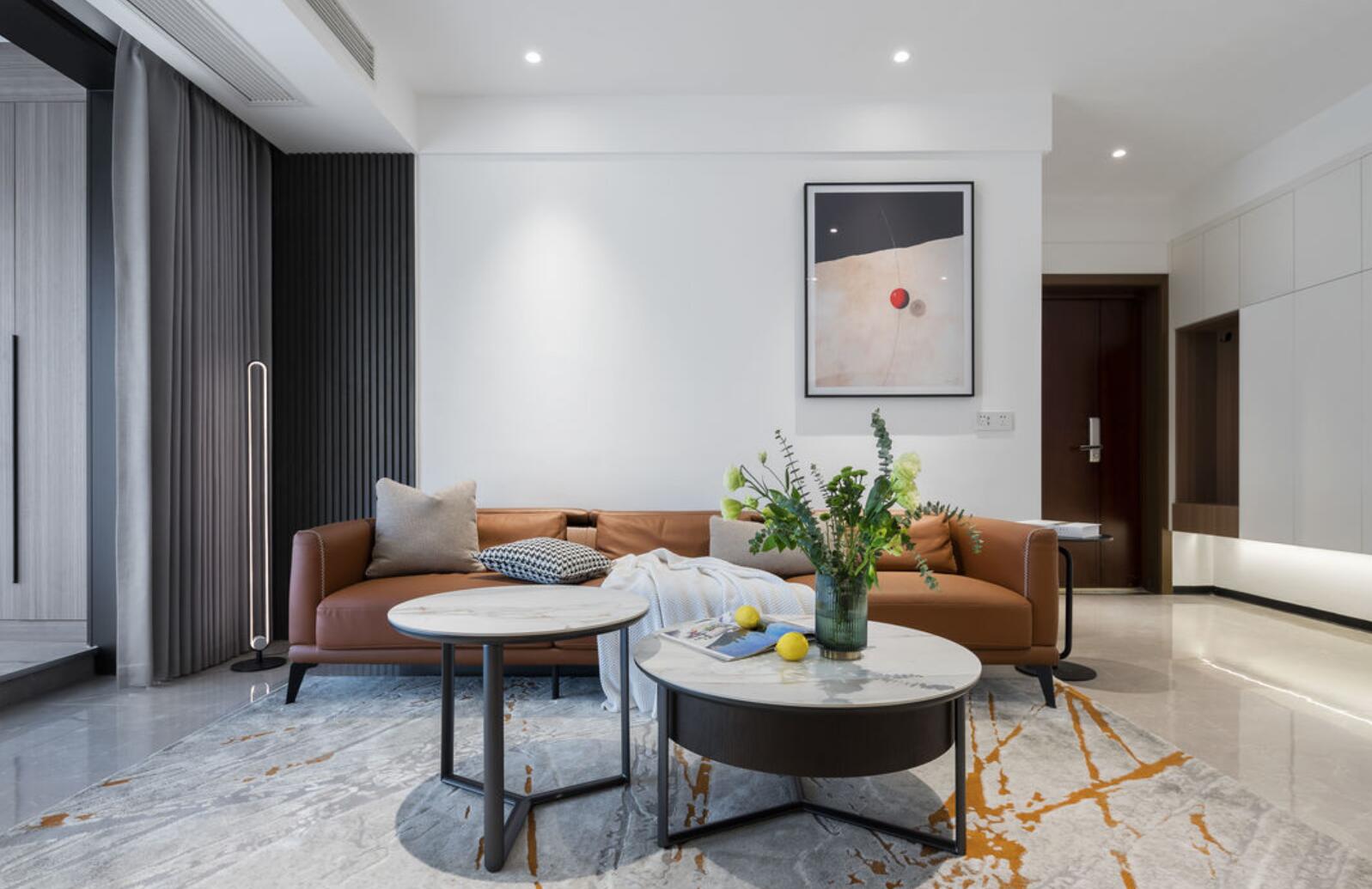 为了与电视墙柜体产生呼应,沙发背景墙在局部位置安装上灰色的木饰面,并通过一幅装饰画做到了视觉平衡,有效地丰富了空间层次。而深黄色的皮面沙发,搭配上大理石材质的圆形茶几,也在这个单调沉稳的空间中,点缀出了一抹时尚元素。