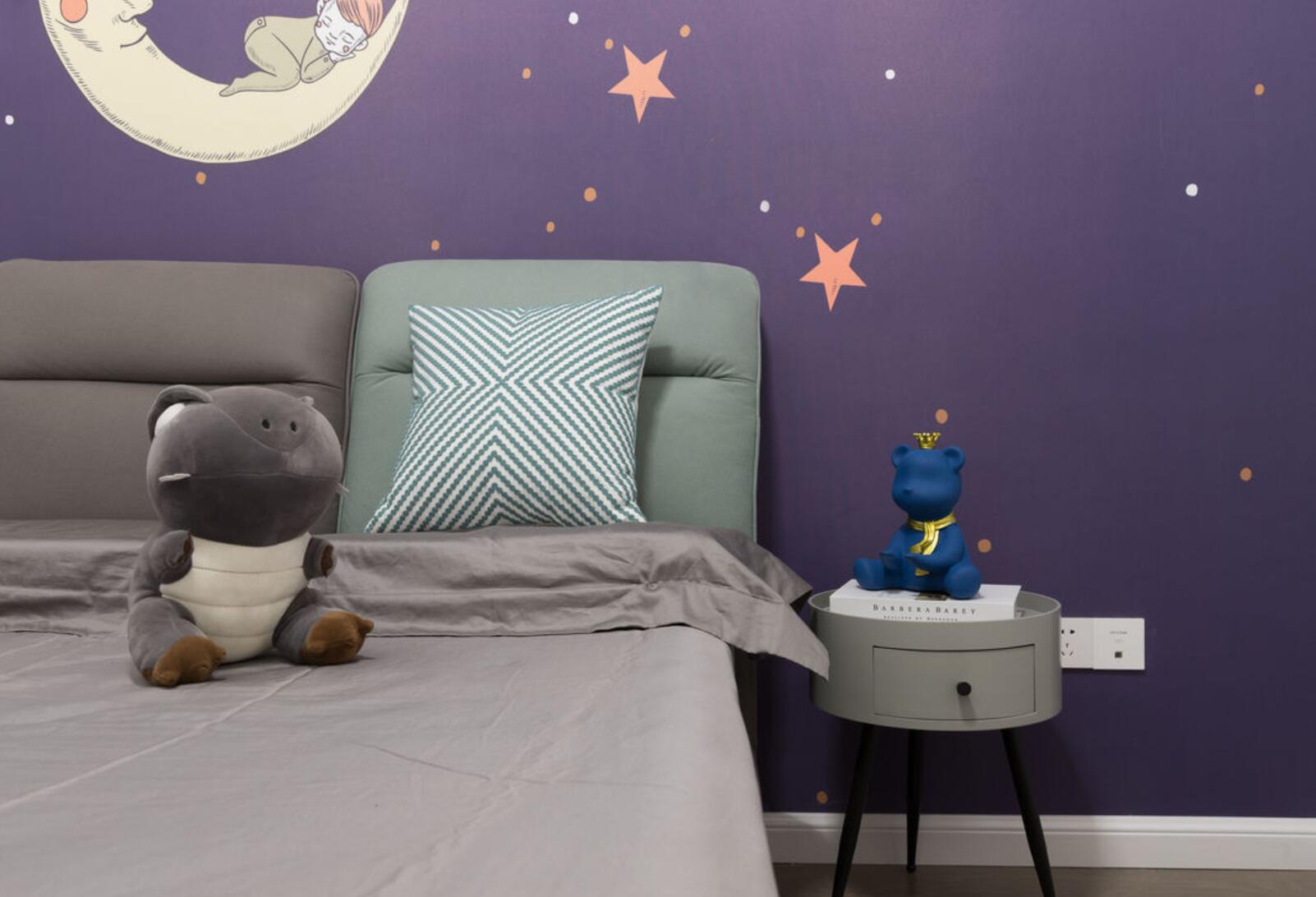 北边最小的房间为儿童房,墙面刷上艺术漆,并用星空图案来装饰,既能符合孩子的审美,也增添了一抹趣味性。不过最值得夸赞的,还是放弃传统榻榻米,并选择成品床这个决定。