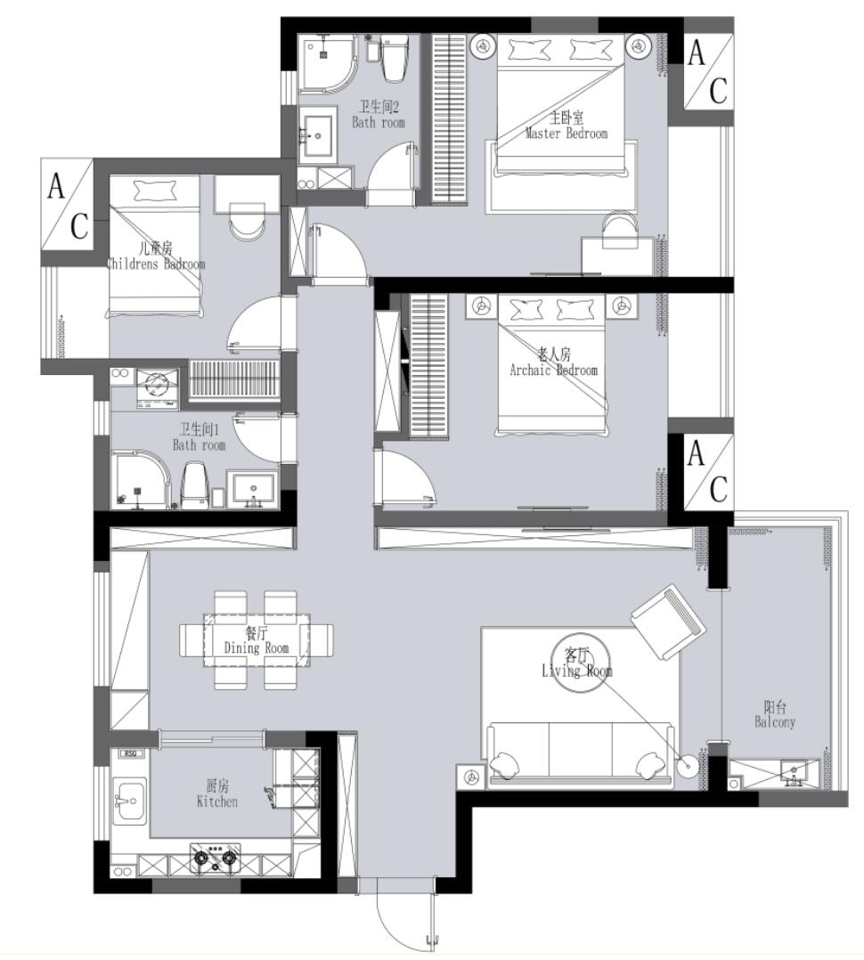 新房建筑面积125㎡,三室两卫的户型,从空间布局上来看,基本上保留了原有的空间结构,仅对部分墙体进行了一些微调整。当然,这也得益于原户型本身就很工整,且屋主一家属于三代人的成员结构,所以一切都要以实用性为主。而进行结构微调整的地方有以下这几点。
