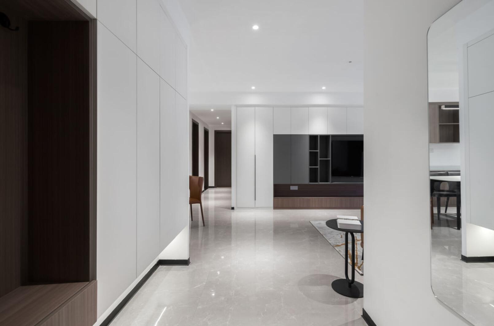 大面积的留白处理,让人一进门就能感受到整洁、明亮的空间氛围。左边配置一组到顶的鞋柜,可以满足全家人的日常收纳需求。柜体底部镂空,并隐藏上灯光,则弱化了柜体的厚重,体现出了轻盈的视觉感。