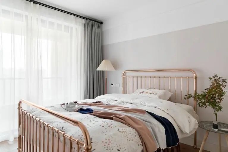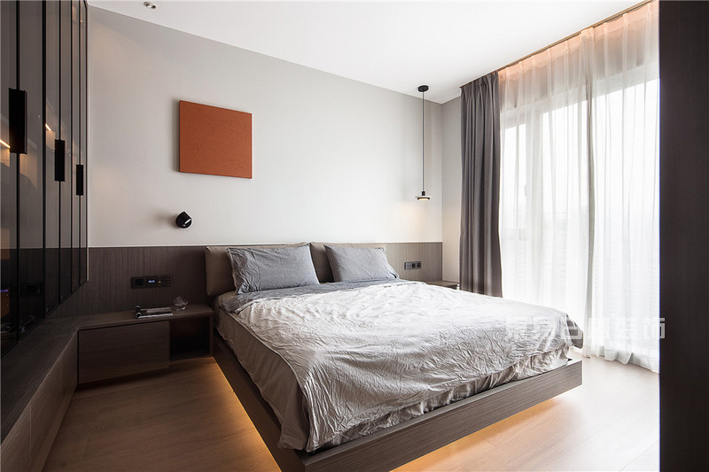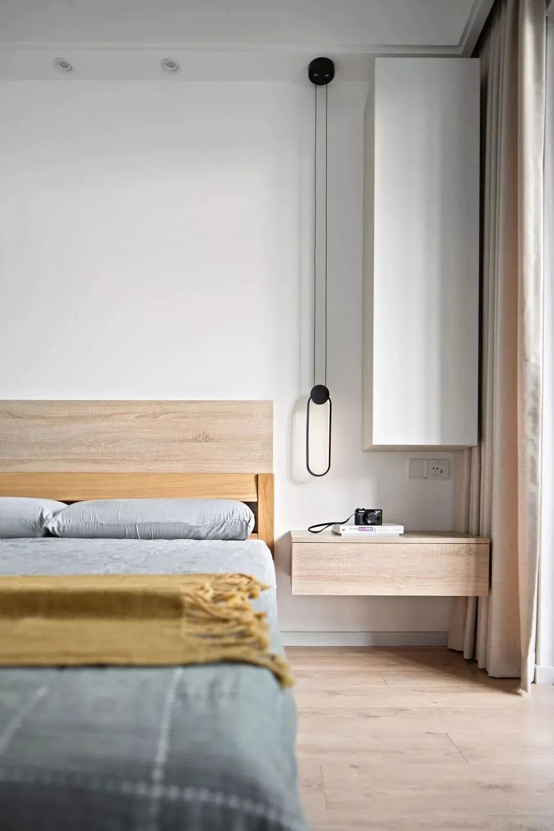如果需要一个床头收纳的家具,可以用悬空床头柜或者床边几,舍弃传统的笨重床头柜,床头柜悬空设计,造型简约不占据过道空间,床两边也更加宽敞,配合隐形抽屉,还满足收纳需求。