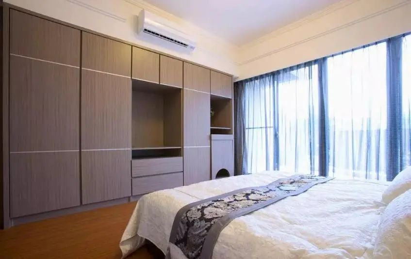 从舒适度考虑,卧室中空调系统不能太低,空调最好挂在床的侧面,避免使用空调时的风直接吹向床铺。