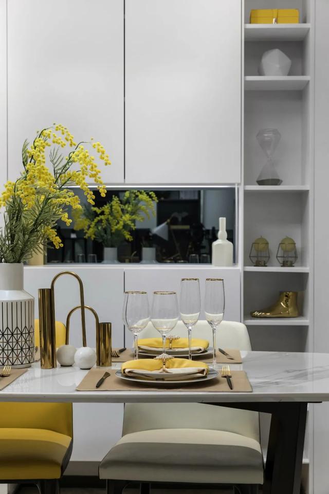 ▲石材台面上,布置精致的花瓶、装饰品、餐具与酒杯,后方柜子的开放格上布置陶艺品,也让用餐氛围显得更加精致高级而优雅情趣。