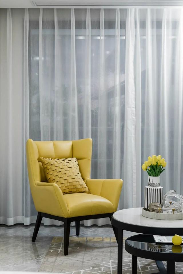 ▲窗户装上纱帘,靠窗布置一张黄色皮艺休闲沙发椅,也为主人提供了一个休闲舒适的体验。
