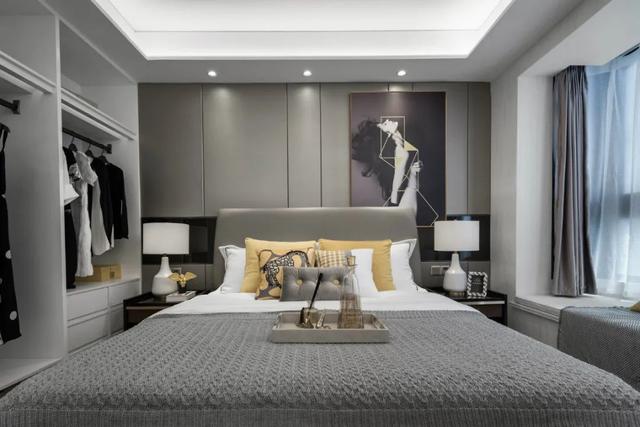 ▲左侧开放式的衣柜,衣物挂在这里方便查找,用起来更加方便;右侧床头墙挂一幅灰色调的时尚人物装饰画,也让空间显得更加现代优雅。