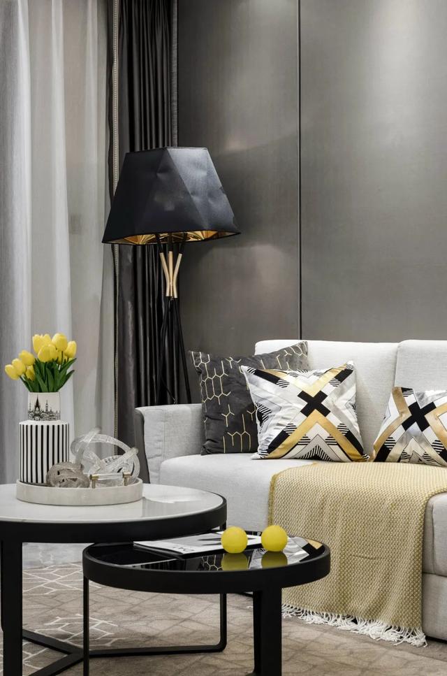 ▲沙发墙上装上灰色硬包护墙板,搭配旁边的灰色窗帘、黑色落地灯,整体空间也是显得更加现代优雅而高级。