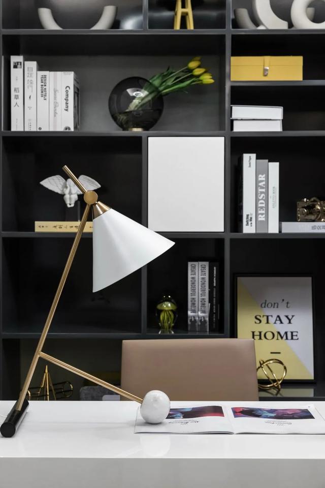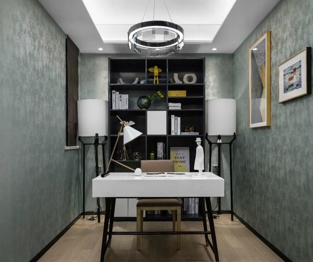 ▲书房空间不大,墙面贴上绿色调的壁纸,中间布置一张书桌,后方靠墙定制一个黑色书架,两侧布置对称的落地灯,为主人营造出一种轻松端庄的工作加班与写字看书的空间。