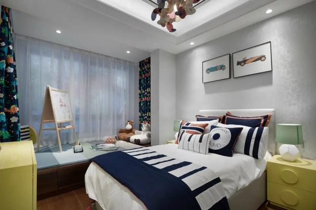 ▲儿童房的墙面贴上灰色墙布,床头墙上挂两幅汽车主题的装饰画,布置蓝白配的床单,加上黄色床头柜与床尾斗柜,整个空间的色彩活泼跳跃,让空间更加有生机感。飘窗垫上软垫,布置画架与玩具公仔的设计,也为小主人提供了一个舒适实用的休闲空间感。
