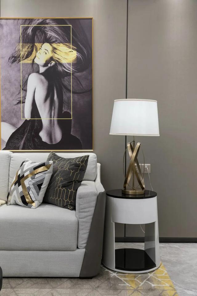 ▲时尚人物背景的装饰画,挂在硬包沙发墙上,搭配灰色布艺沙发,边上的小边几上布置金属架的台灯,也让空间显得更加现代优雅而档次。