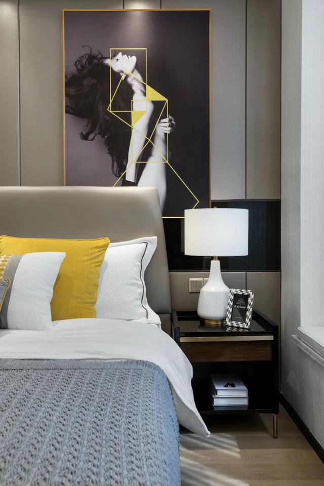 ▲几何线条与人物结合的装饰画,让空间现代而时尚大方。床头柜布置台灯与相框,也为空间带来一种明亮优雅的空间体验。