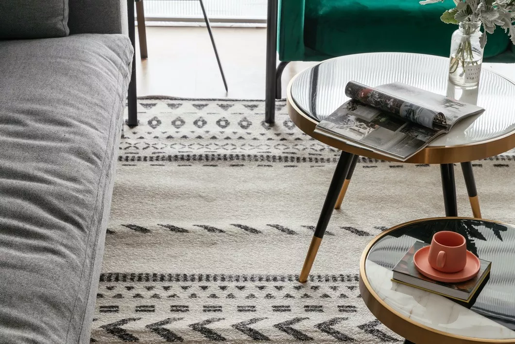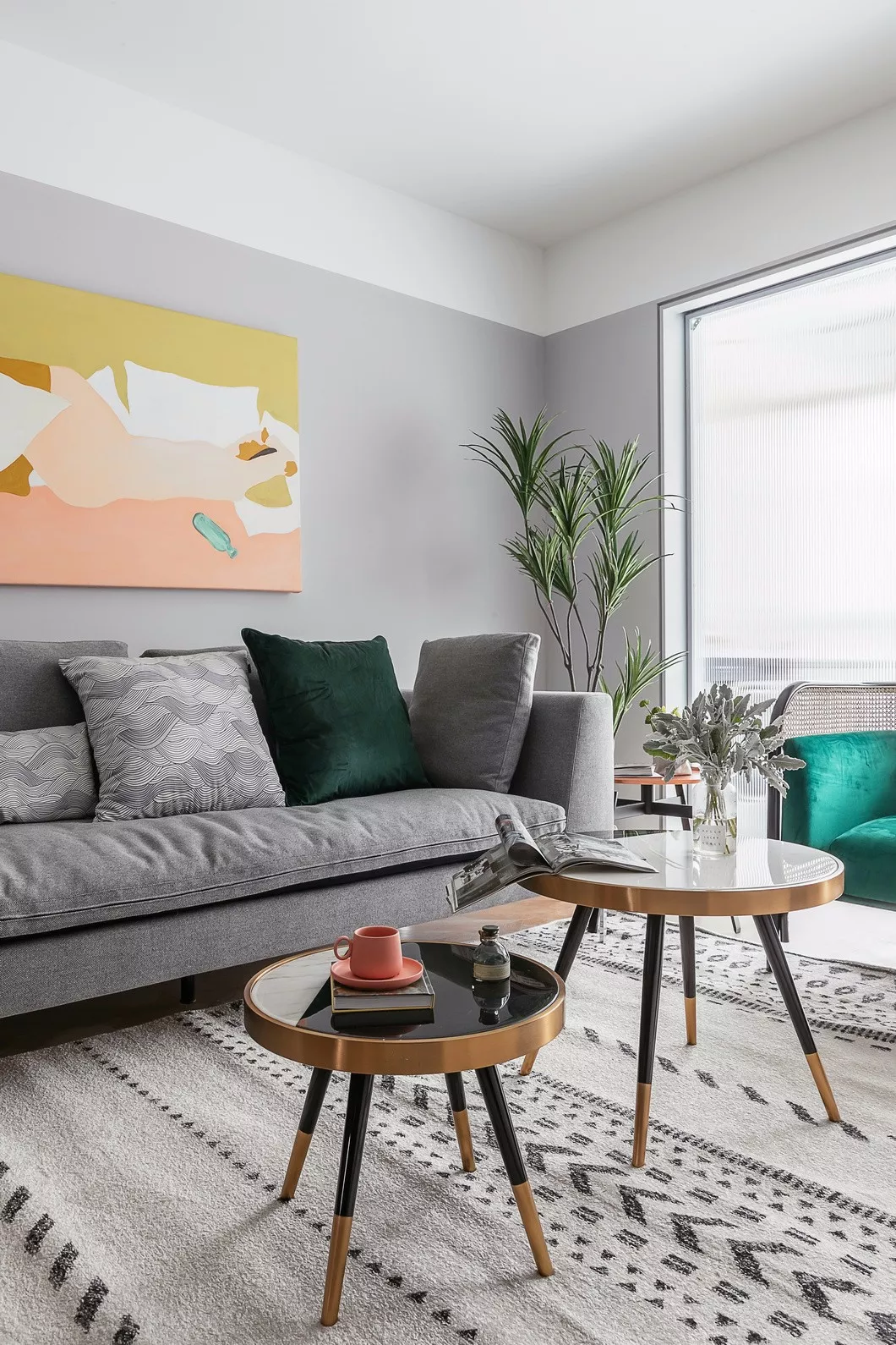 米色短绒几何图案地毯清爽整洁,且不易藏污垢和灰尘。皮质坐凳、黑白撞色金属框茶几、青葱绿植、抽象装饰画,每一个细节都饱含对生活热情和对艺术欣赏。
