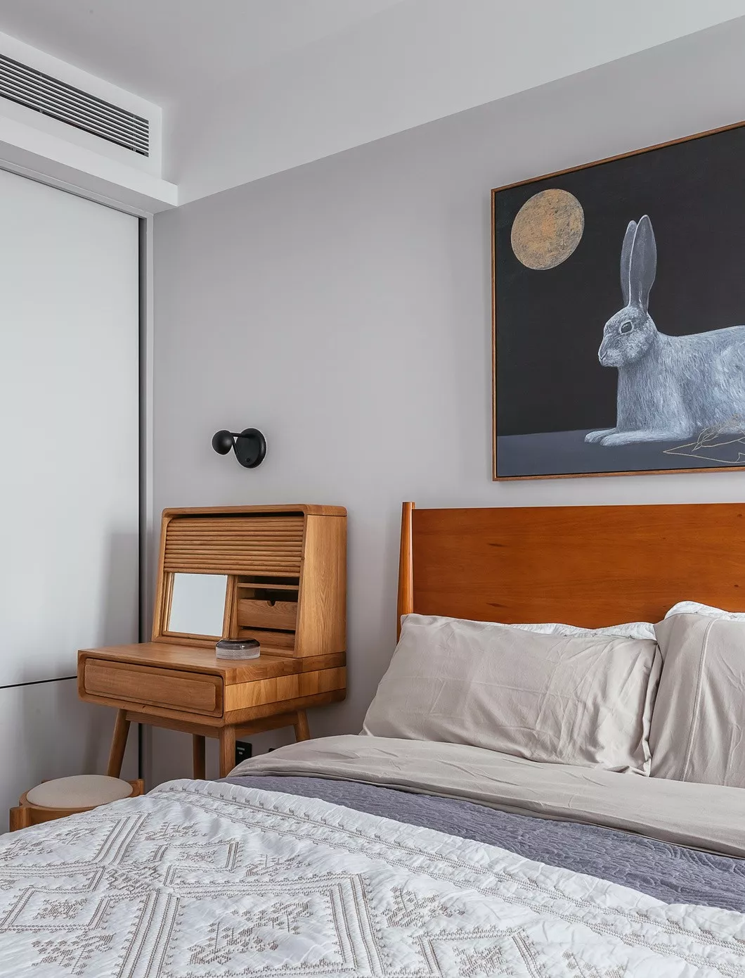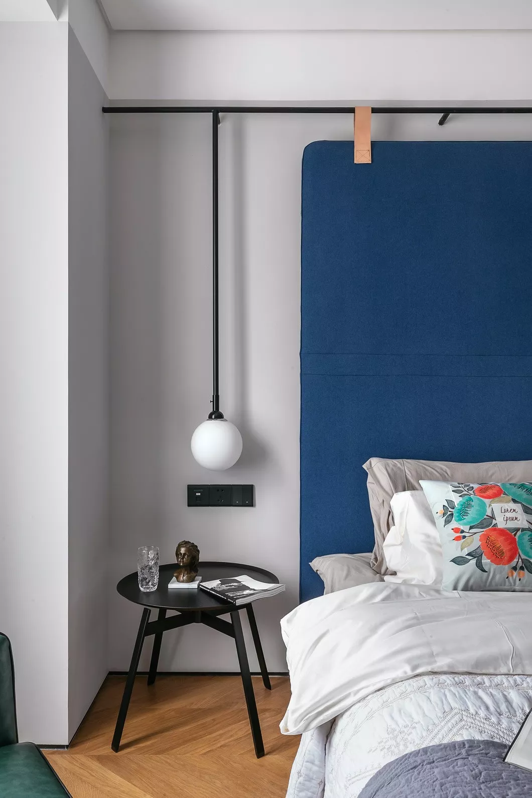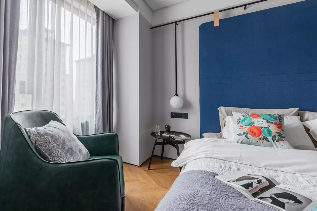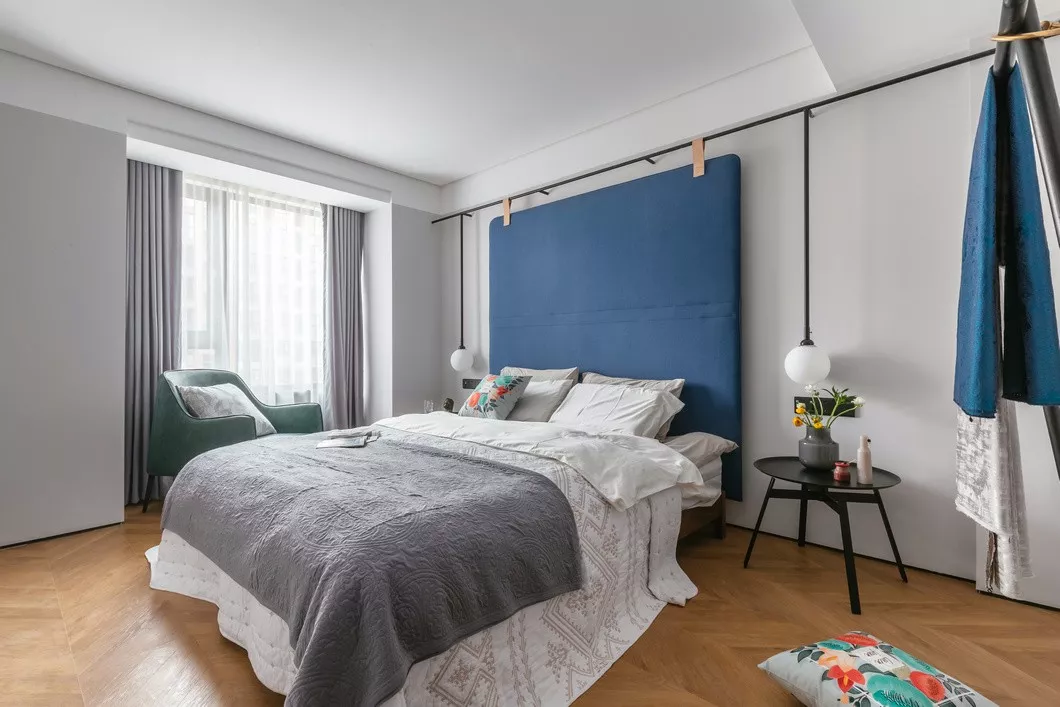 床头做了特别的硬包处理,绒布材质更易于日常打理,而且价格实惠。