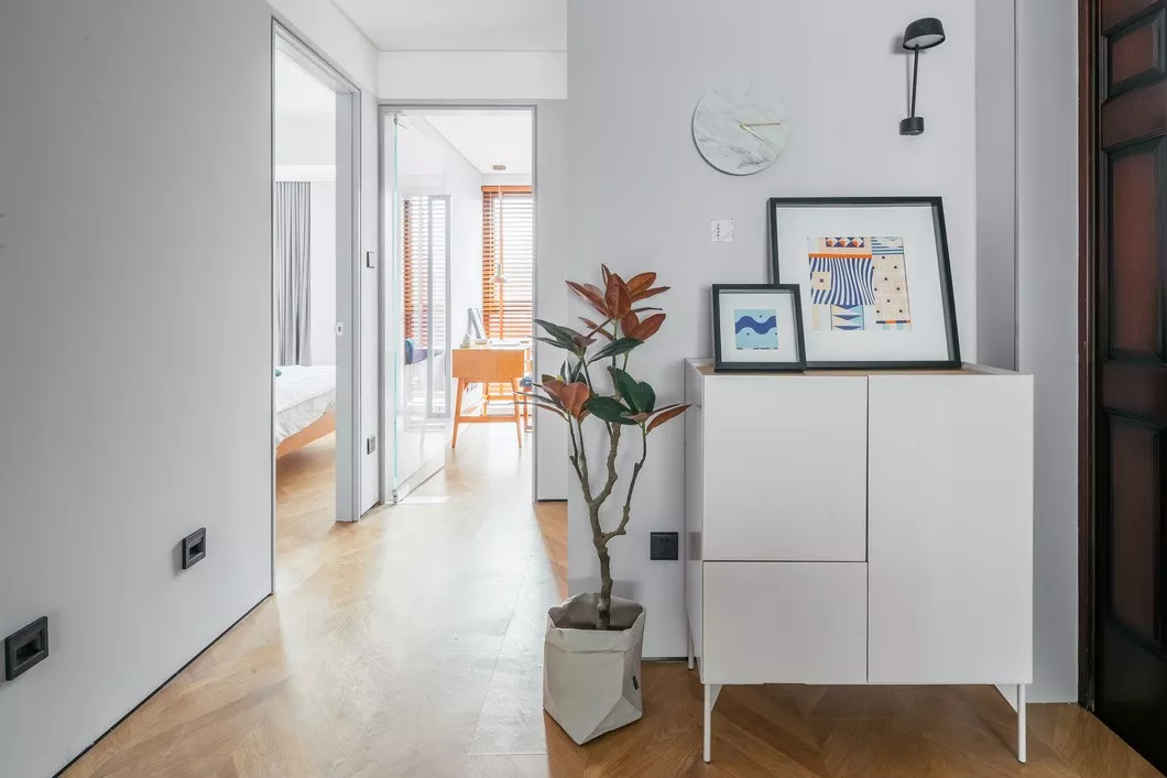浅系藕粉色鞋柜精巧,线条纤细却有力,足够安放进出门鞋履;右侧柜体内部特别设计了衣架,让“隔夜衣”有很好去处。新式大理石面板时钟极具创意,配上设计师灵感乍现DIY装饰画,清新淡雅,是初遇时刻。