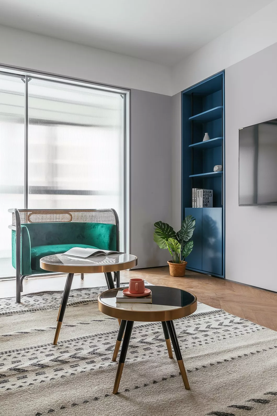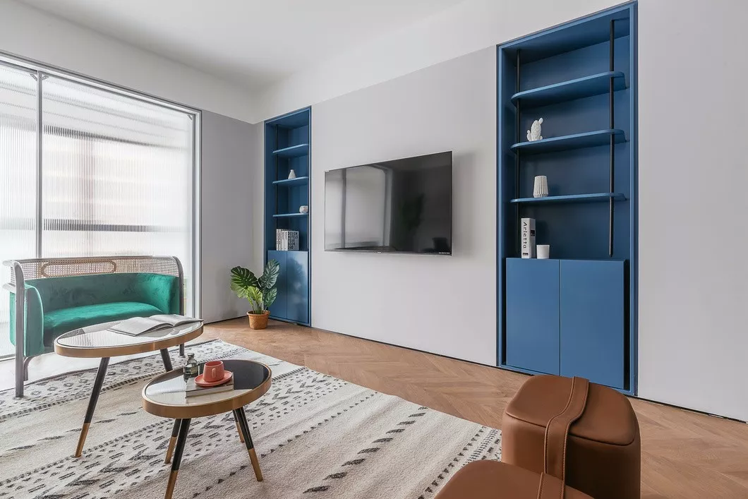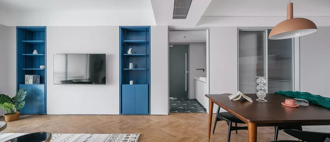 电视背景墙延续简约风格设计,内嵌式蓝色储物柜特意设计成对称样式,达到平衡整个区域重心目的。纯色以其特有明亮和澄净,给人一目了然的舒心。