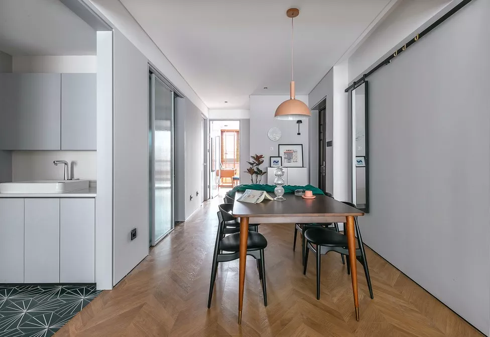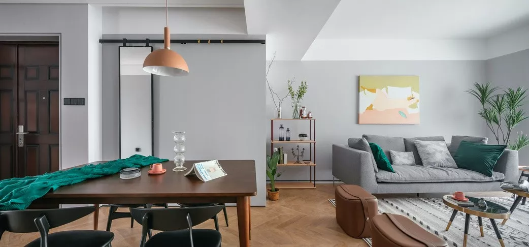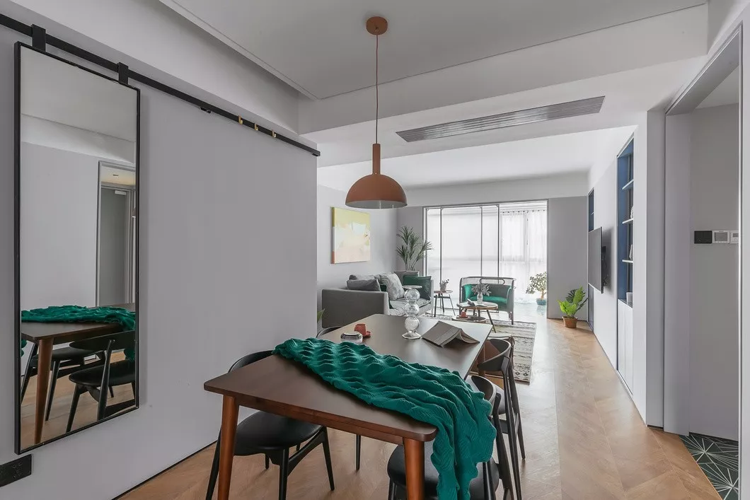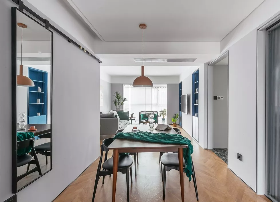 餐厅,少见散逸着浪漫自由气息。门厅面积不够,设计师大胆地把全身镜融入移动轨道安置在餐厅墙面上,可根据实际生活中使用需要随意移动,强电箱刚好被完美遮挡。