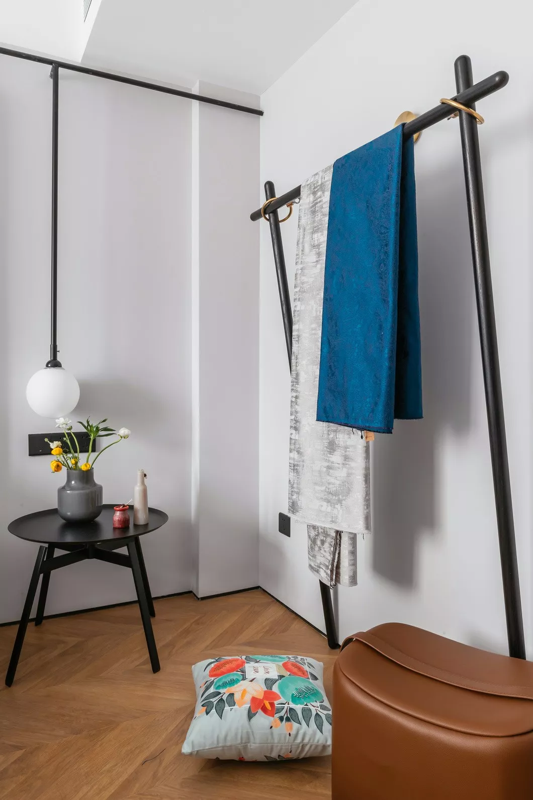轨道在保证安全和质量前提下,特别定制了细线条以求统一设计风格。轨道一侧DIY了三个挂衣钩,挂上衣物和包包又是一番风景。