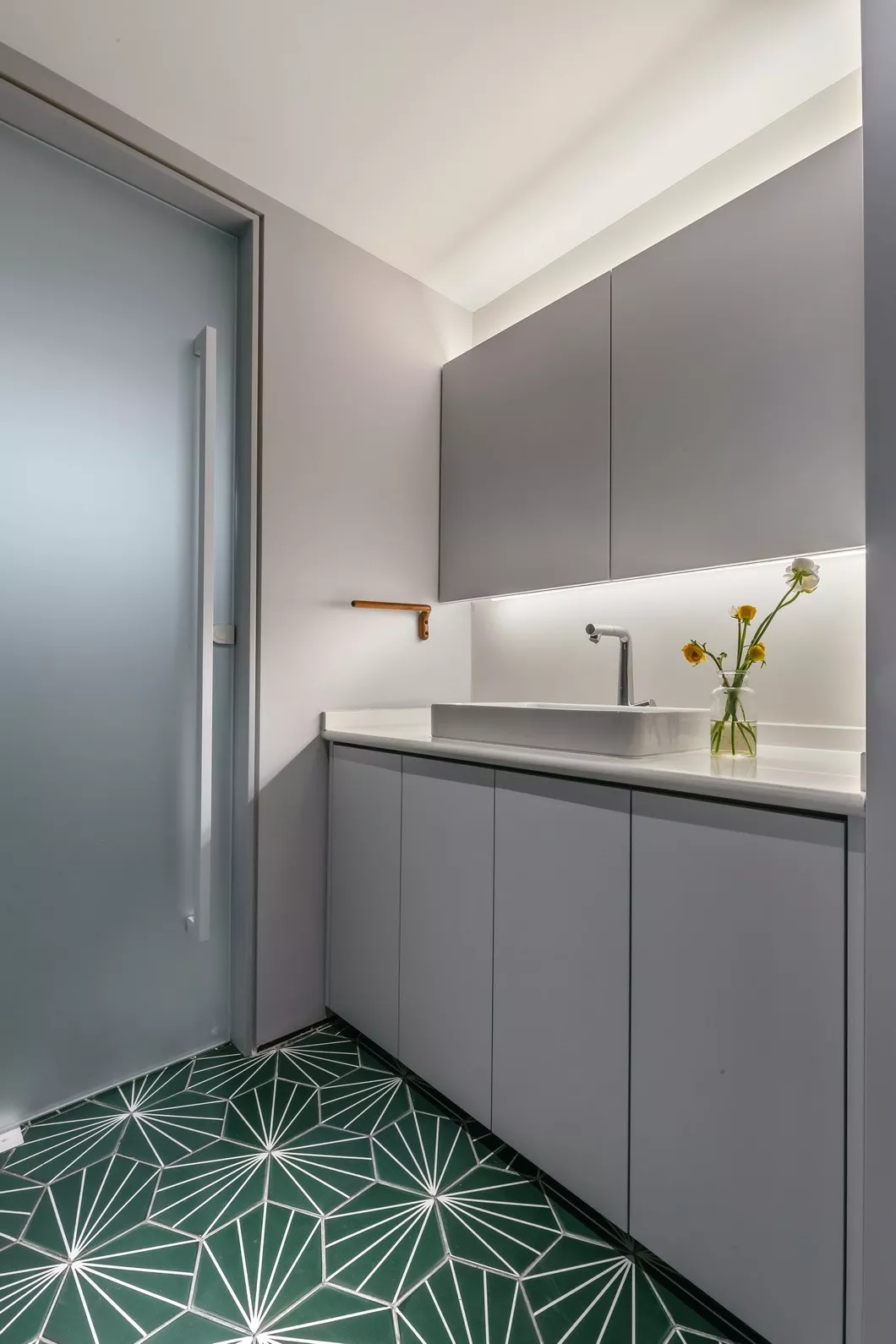 隐藏镜子处理为每一位爱美女性贴心地增加了存放洁面和护肤品空间。舍去过多装饰,只延续主调色彩,让整体空间舒适整洁、纤尘不染。将颜值、功能性与创造性三者结合,少即是多。
