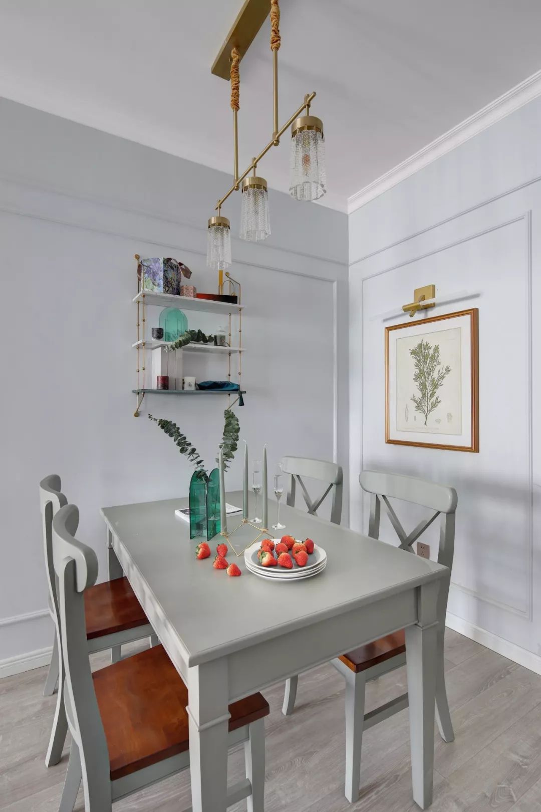 餐厅就在客厅边上延续客厅风格,灰绿色餐桌椅搭配上,绿植装饰、挂画等,让用餐环境更有氛围。