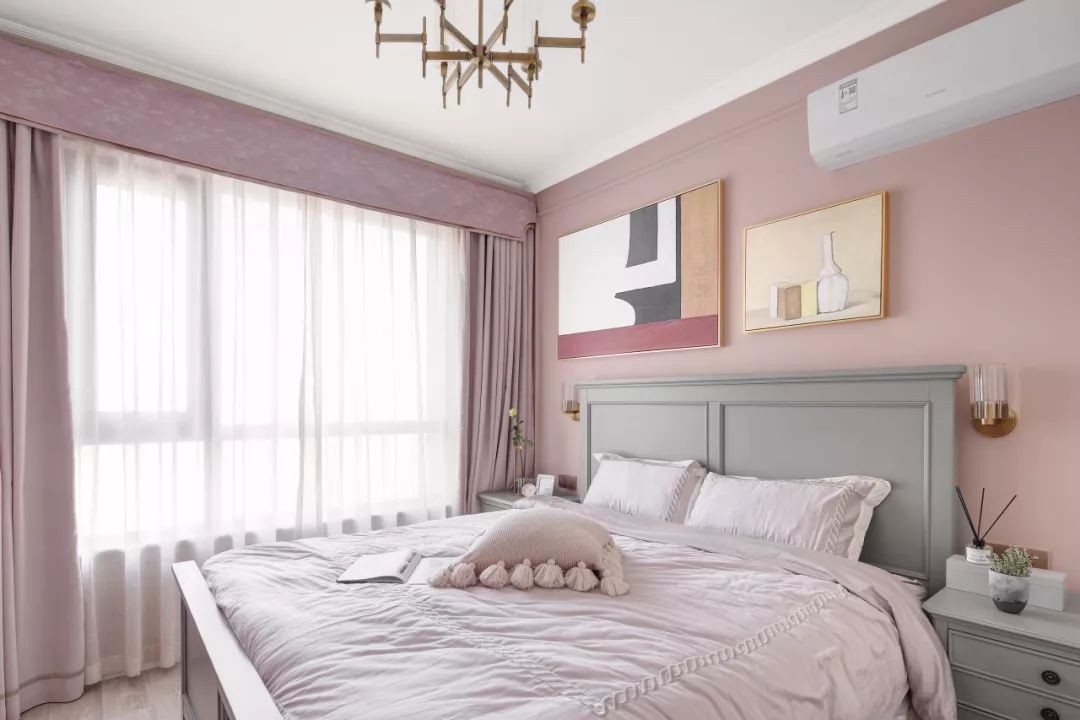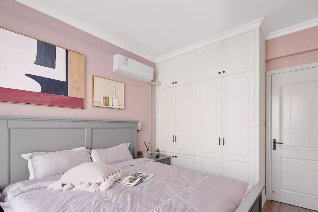 主卧整体以粉色调为主搭配上灰色床和白色衣柜,显得温馨又雅致。